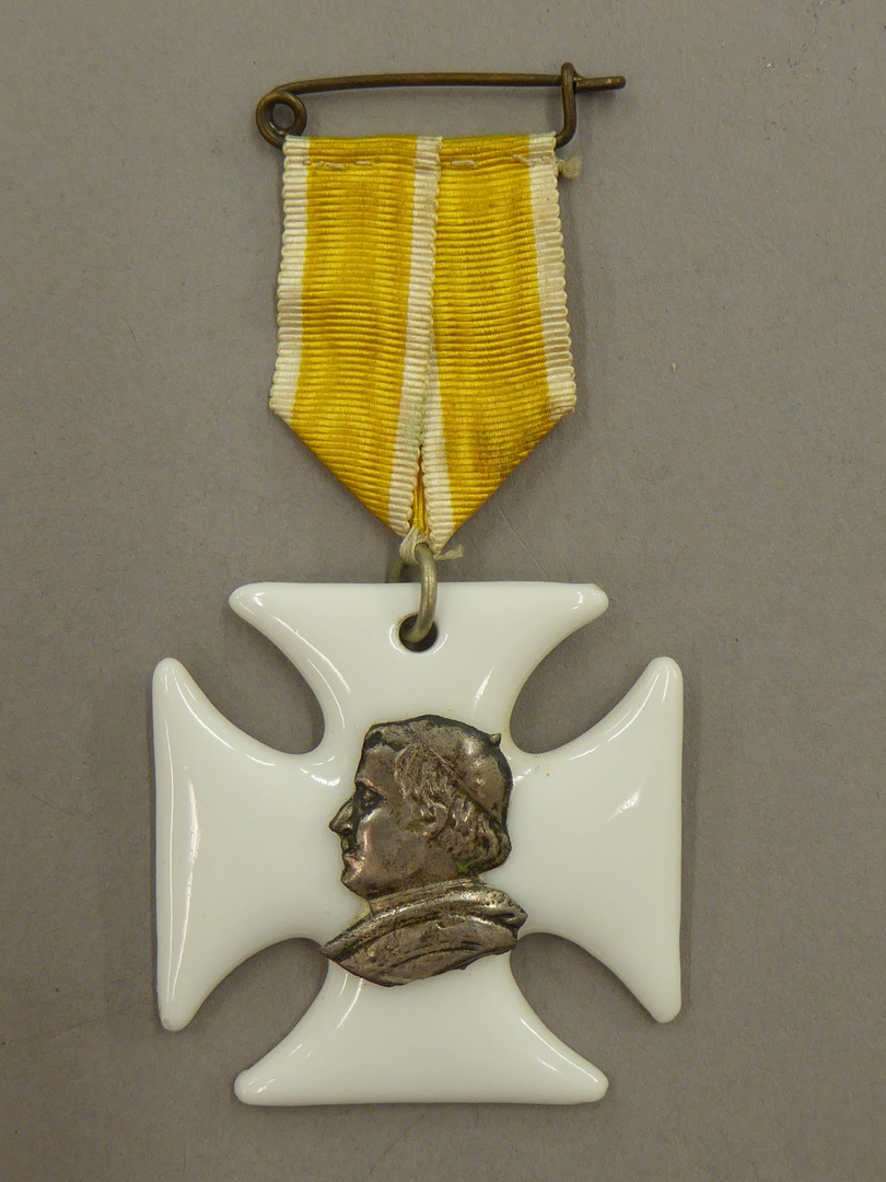 Draagteken in vorm van gelijkbenig kruis aan lintje met portret paus Pius X, kz. blanco