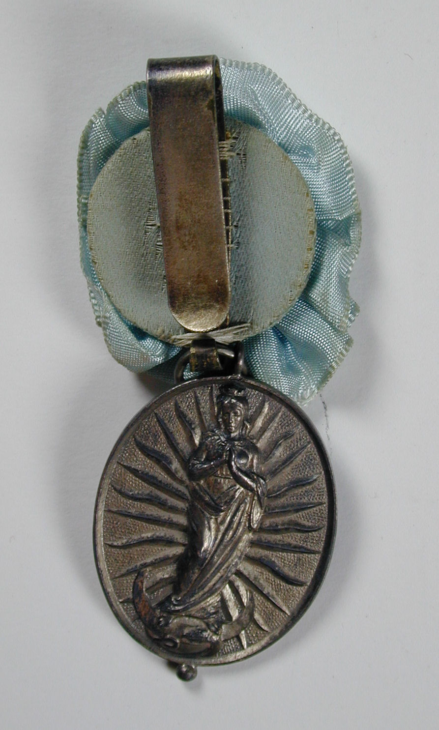 Penning met Maria in stralenkrans op maansikkel, slang vertrappend, aan lichtblauw rozet
