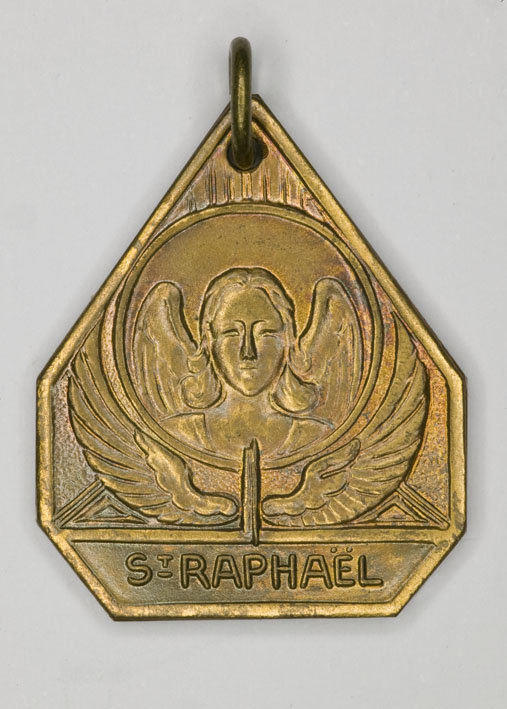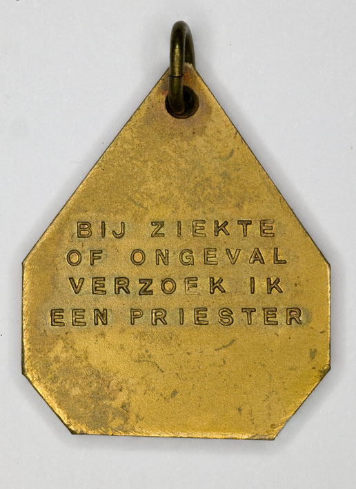 Draagpenning van spoorwegvakbond St. Raphaël, dienend als godsdienstcodicil, kz. "Bij ziekte of ongeval verzoek ik een priester"