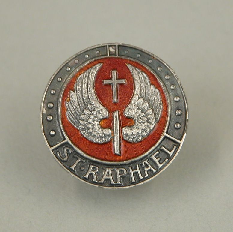 Jubileuminsigne, zg. 'knoopsgat', bij 25-jarig lidmaatschap van spoorwegvakbond St. Raphaël met kruis, gevleugeld wiel en "St. Raphaël"