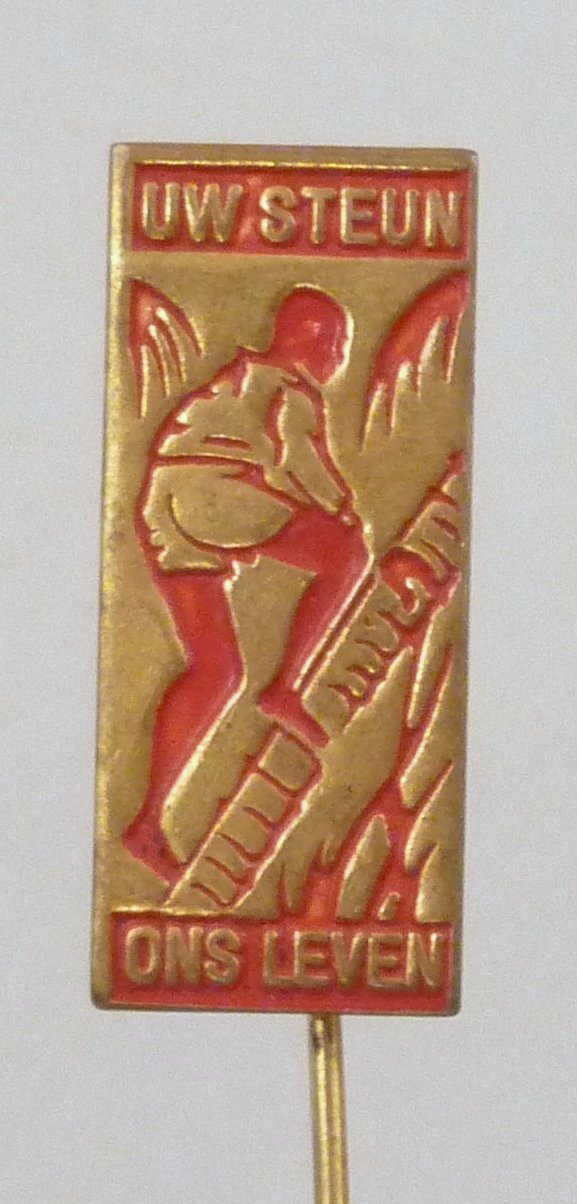 Rood speldje met "Uw steun ons leven" met Afrikaanse man die in palmboom klimt