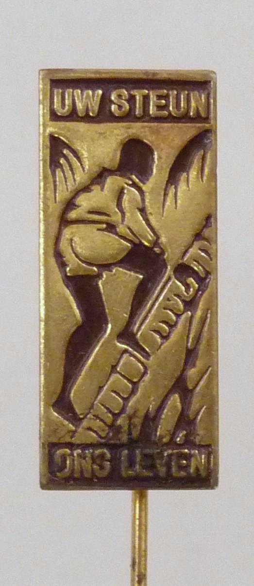 Bruin speldje met "Uw steun ons leven" met Afrikaanse man die in palmboom klimt