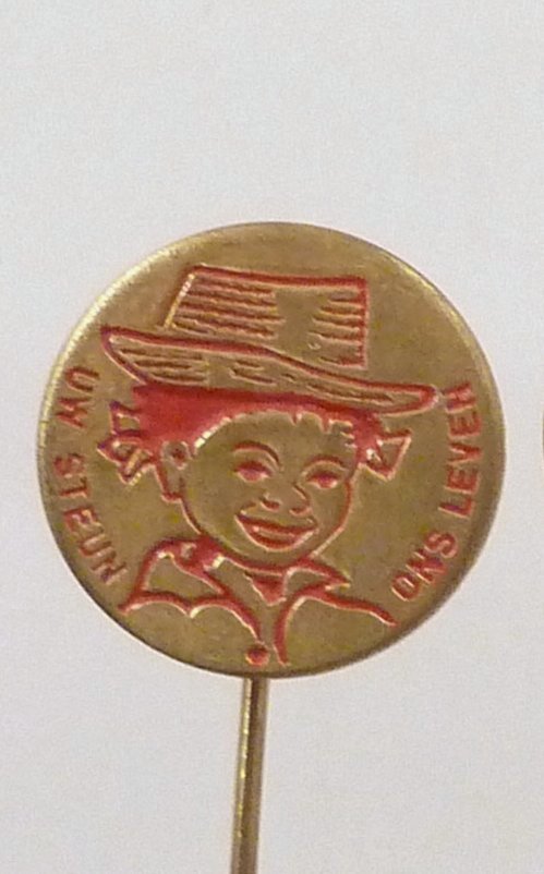 Rood speldje met "Uw steun ons leven" met jongenskop met strohoed op