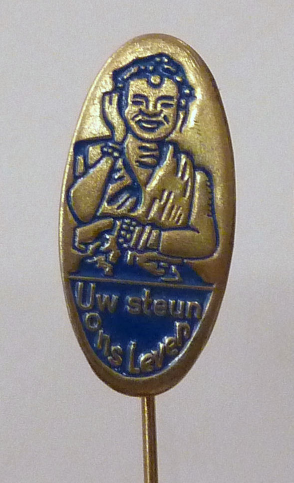 Blauw speldje met "Uw steun ons leven" met zittende vrouw ten halve lijve