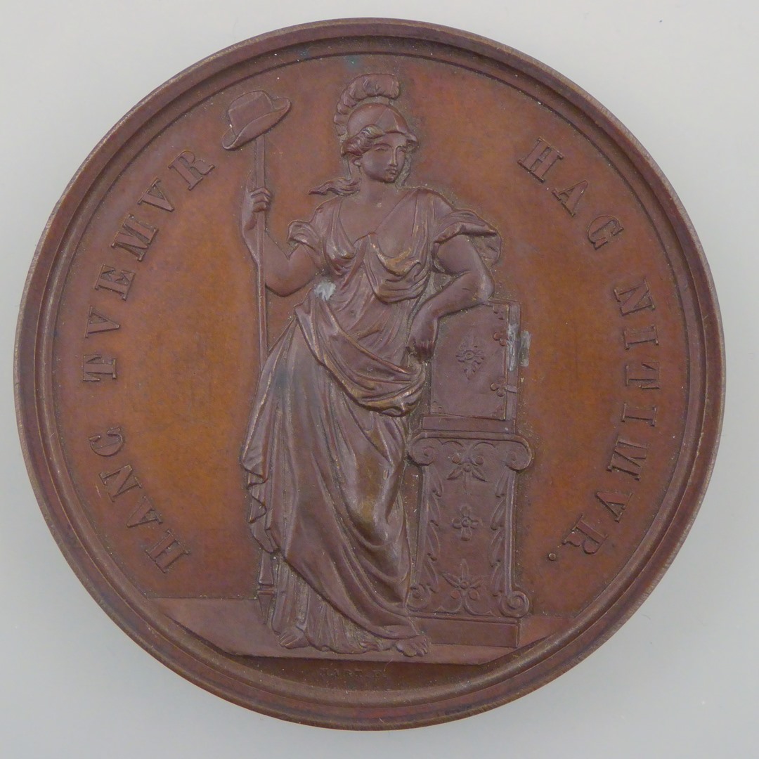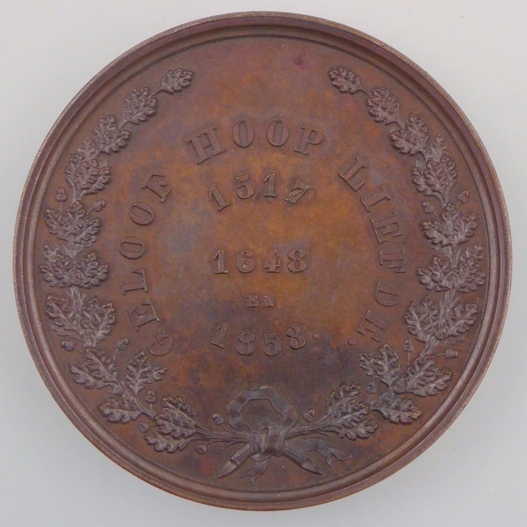 Herdenkingspenning Aprilbeweging 1853 met Nederlandse maagd met staf, kz. bladerkrans met "geloof hoop liefde 1517 1648 1953"