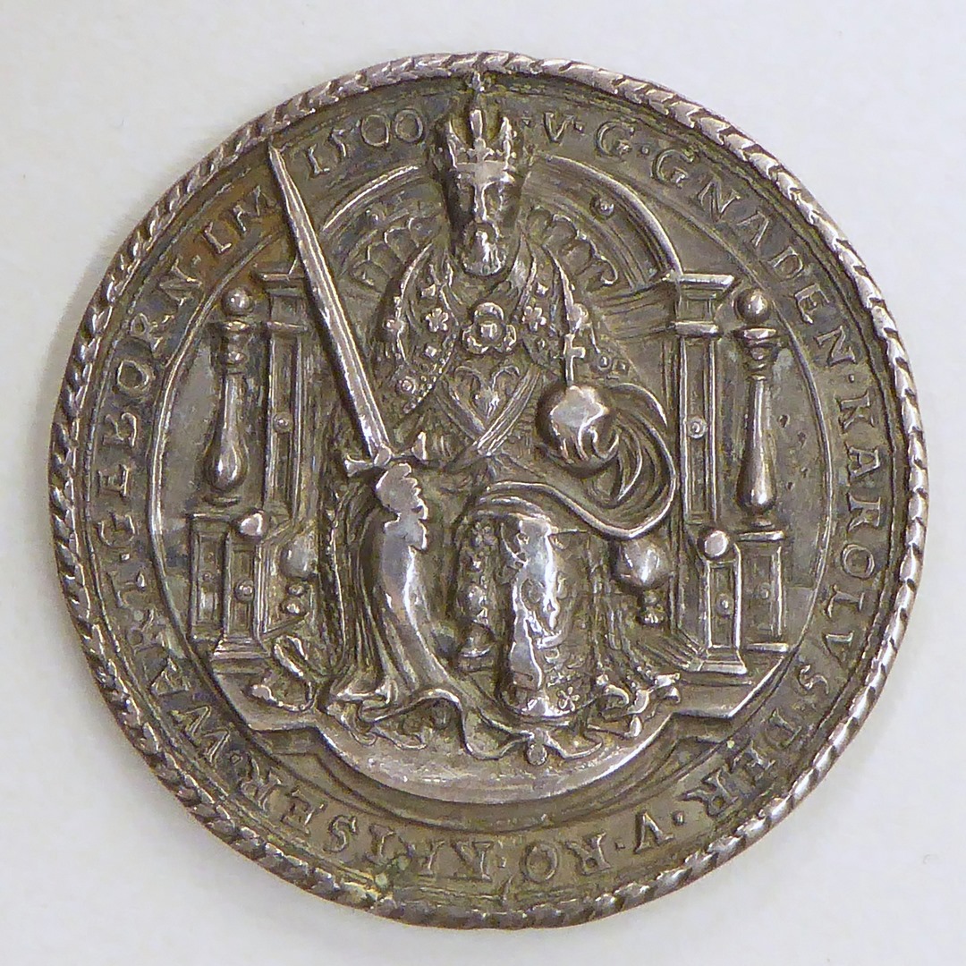 Gedenkpenning 50ste verjaardag Karel V met Karel V op troon, kz. Christus koning op troon
