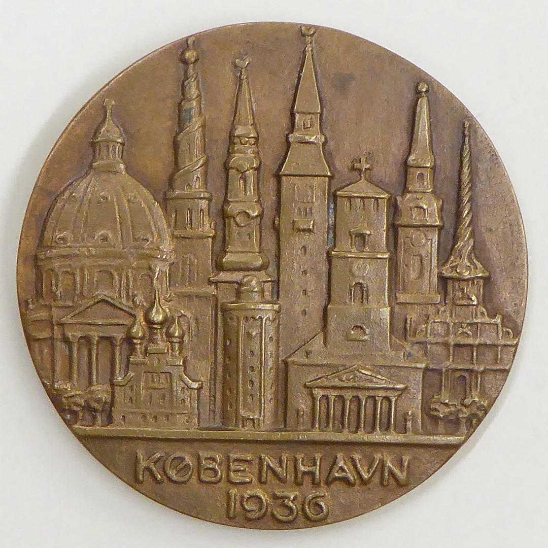 Gedenkpenning internationaal taalkundig congres in Kopenhagen met twee mannen, één met baard, met "Linguistes", kz. met "Kobenhavn 1936"