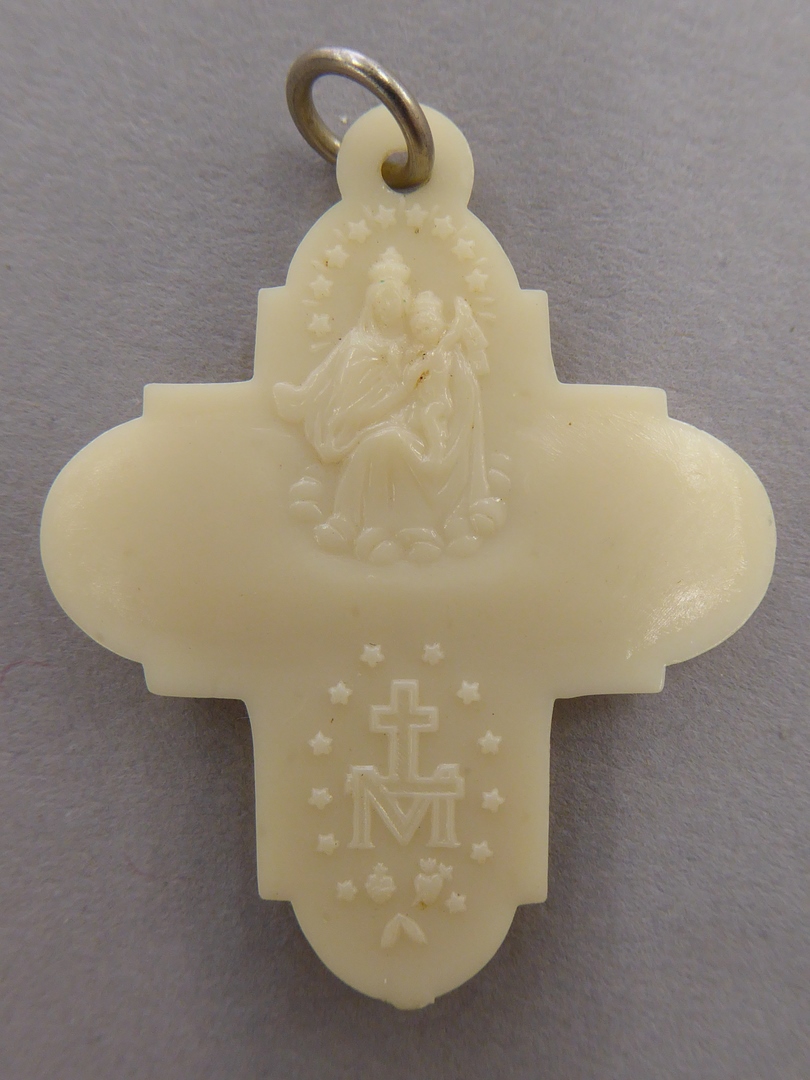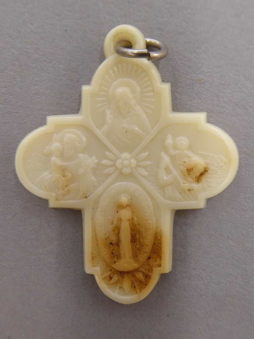 Hangertje met beelden ontleend aan Wonderdadige Medaille: Christus, Christoffel, Jozef en Maria