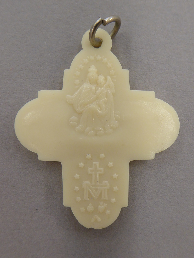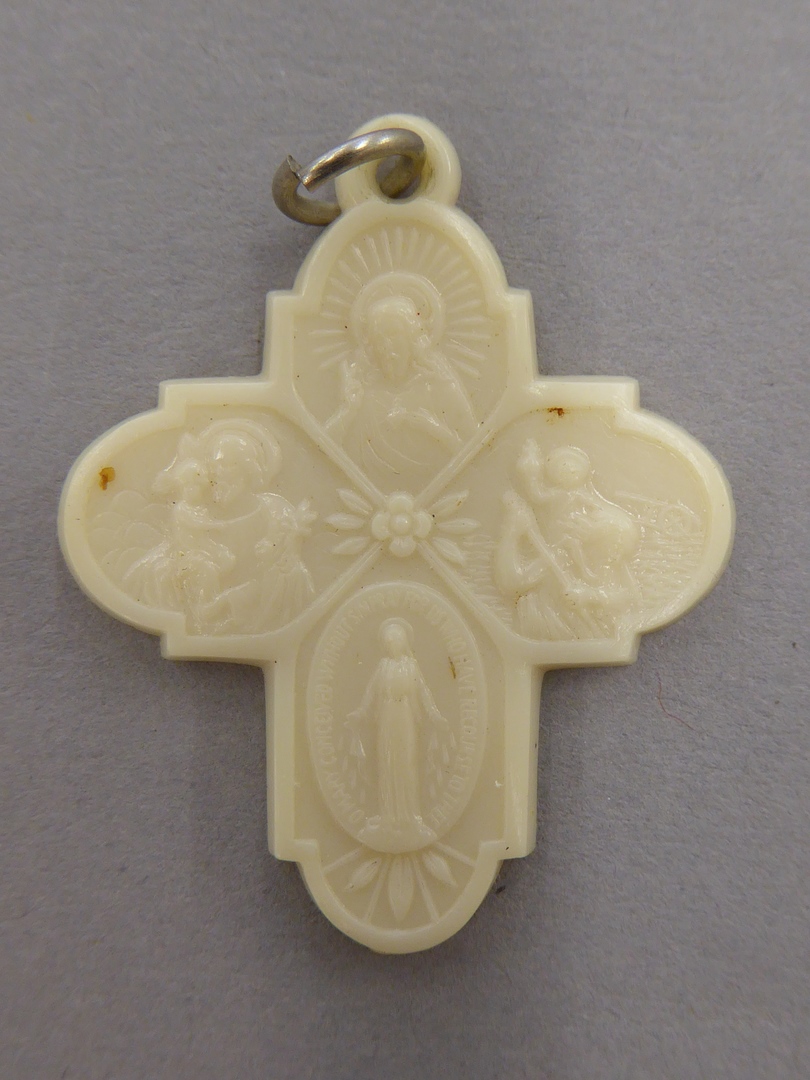 Hangertje met beelden ontleend aan Wonderdadige Medaille: Christus, Christoffel, Jozef en Maria