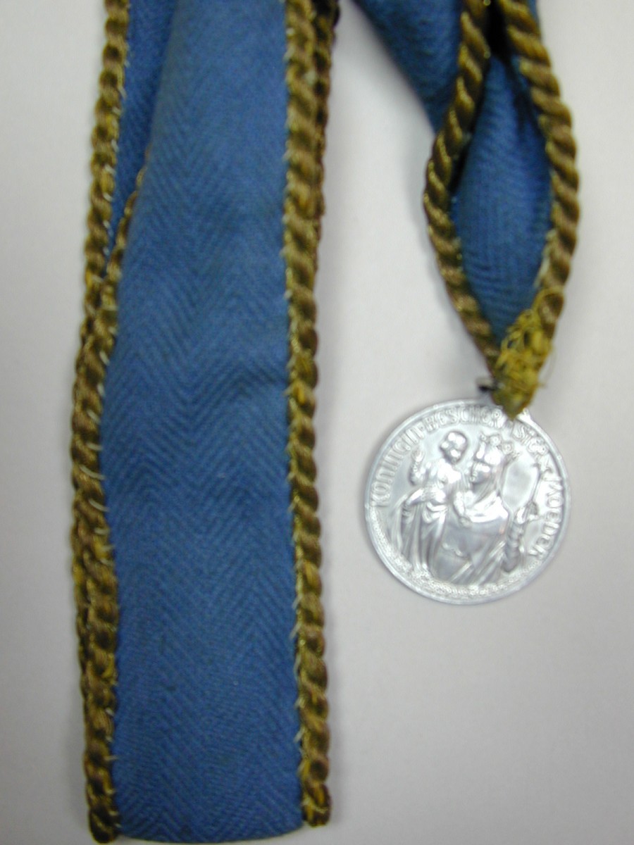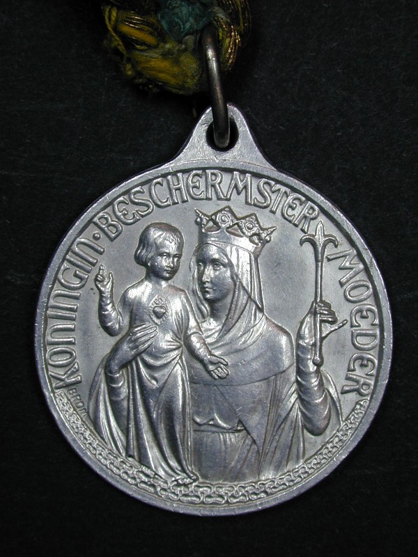 Draagpenning, Maria met kind en "koningin-...", kz. met "Mariacongregatie", aan blauwe draagband