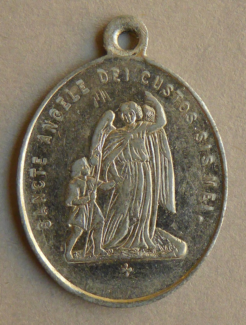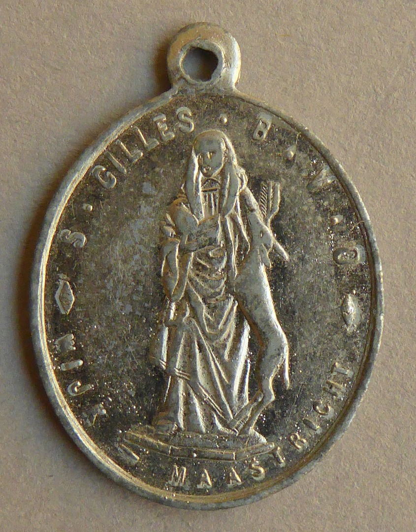 Bedevaartspenning met St. Gilles met hert en "... Wijk - Maastricht", kz. engelbewaarder met kind