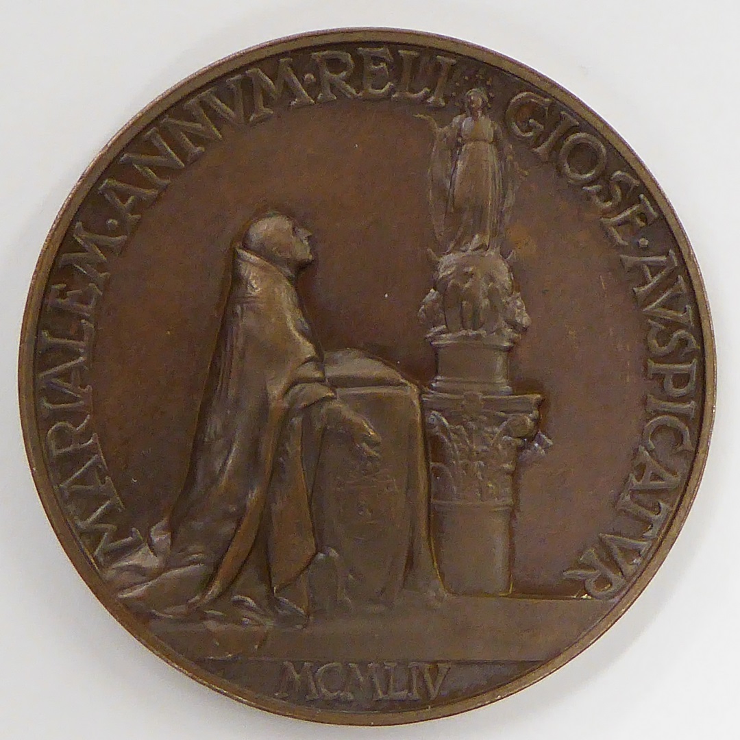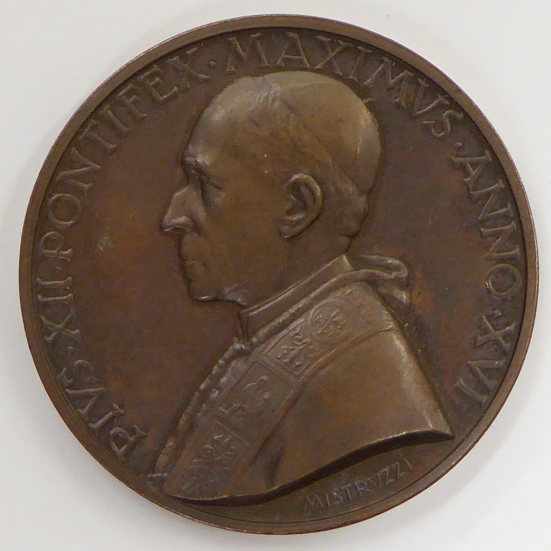 Pauspenning met portret paus Pius XII (1939-1958), kz. paus knielend voor Mariabeeld
