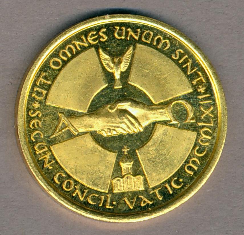 Gedenkpenning Tweede Vaticaans Concilie met buste Christus, kz. twee handen, Alfa en Omega, tekst