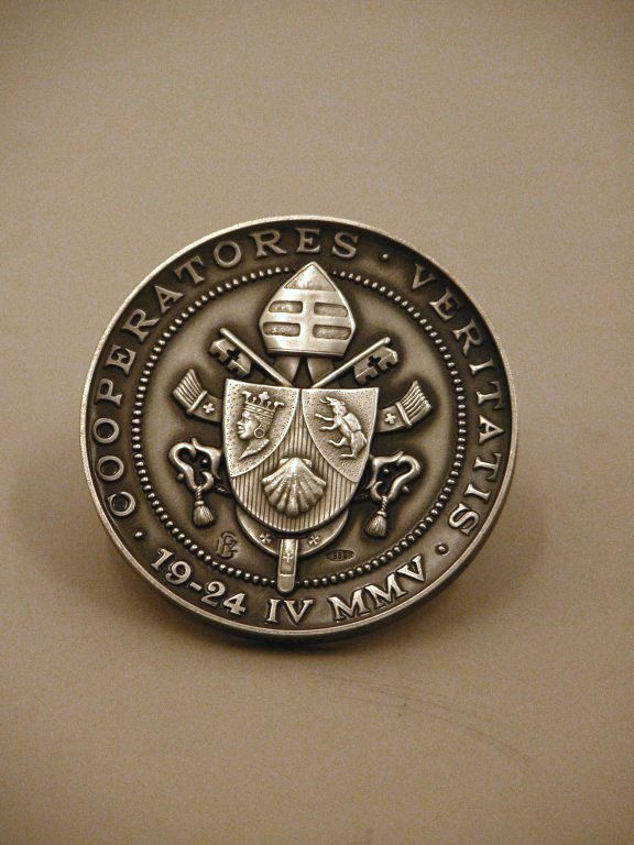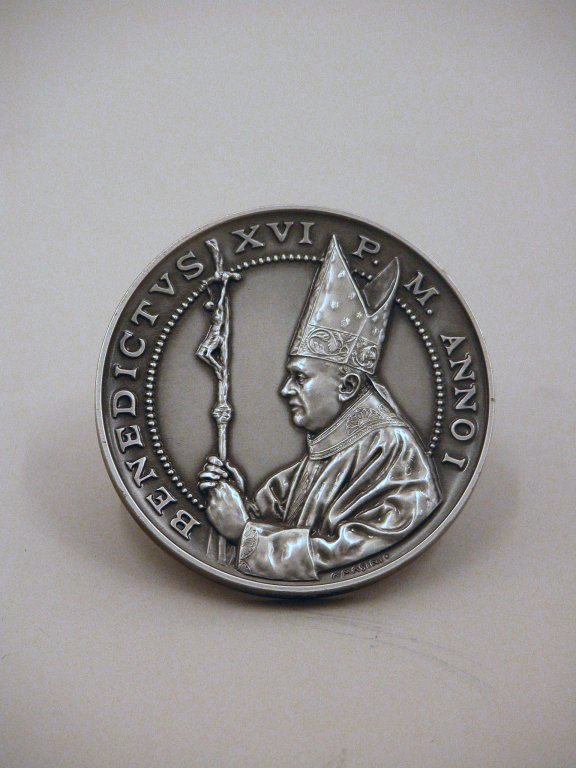 Pauspenning met paus Benedictus XVI met staf, en profil, kz. wapenschild van Benedictus XVI. Voorz.: Paus Benedictus XVI en profil met mijter en kruisstaf. Opschrift: BENEDICTVS. XVI. P.M. ANNO. I Keerz.: Wapenschild van Benedictus XVI, met gekruiste sleutels en de mijter. Opschrift: COOPERATORES VERITATIS 19-24 IV MMV