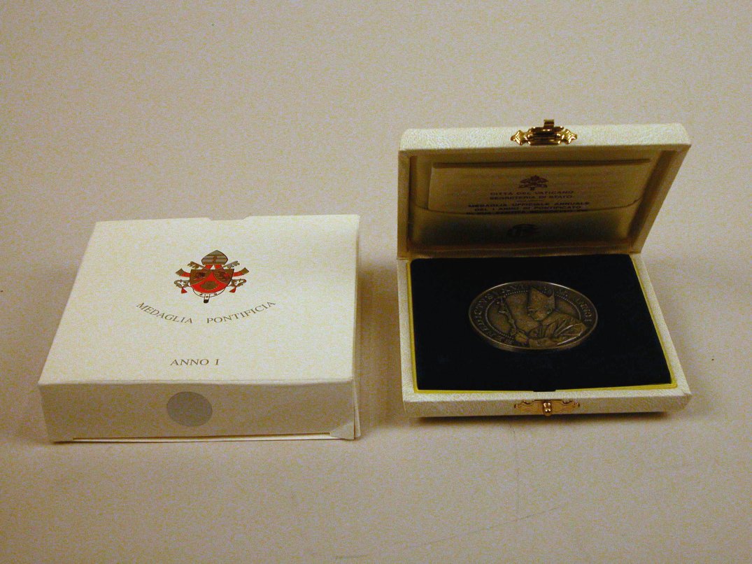 Wit kartonnen doosje met "... anno I" met etui waarop wapen paus Benedictus XVI waarin echtheidscertificaat nr. 3079 van 6000, voor RMCC p299a