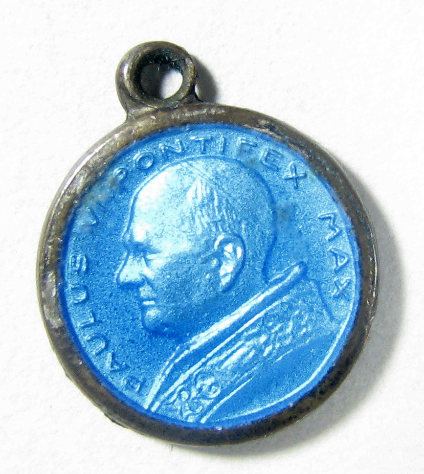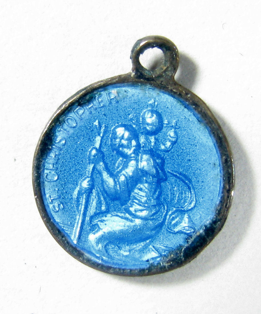 Blauw bedevaarthangertje met profiel paus Paulus VI, kz. voorstelling H. Christoffel
