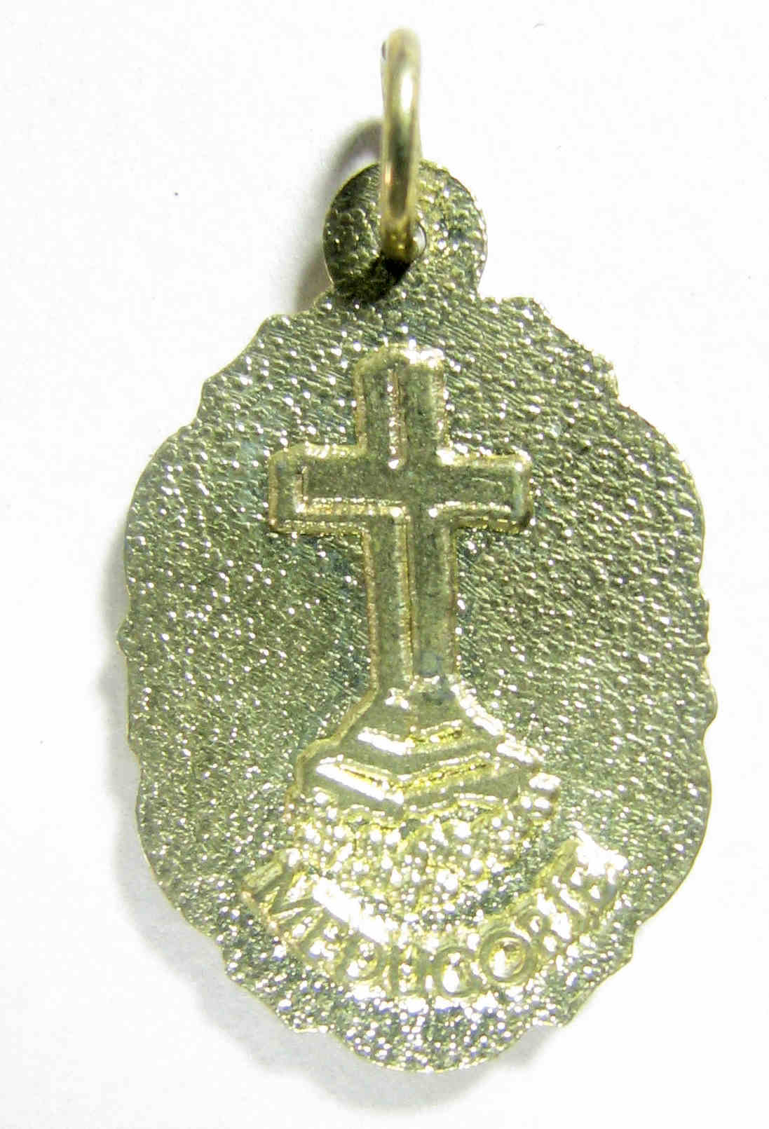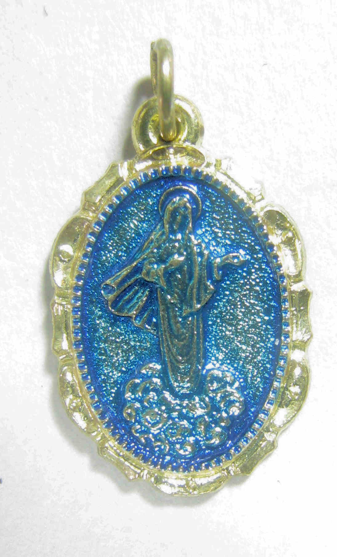 Ovale goudkleurige penning van een Mariabedevaart naar Medugorje Vz.: Maria (in blauw) Kz.: Voorstelling van het Kruis (met onderschrift 'Medugorje')