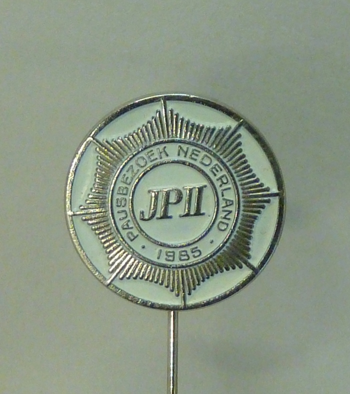 Rond wit steekspeldje uit set van vier, met stralenkrans, randschrift 'pausbezoek Nederland 1985' en in het midden 'JPII'