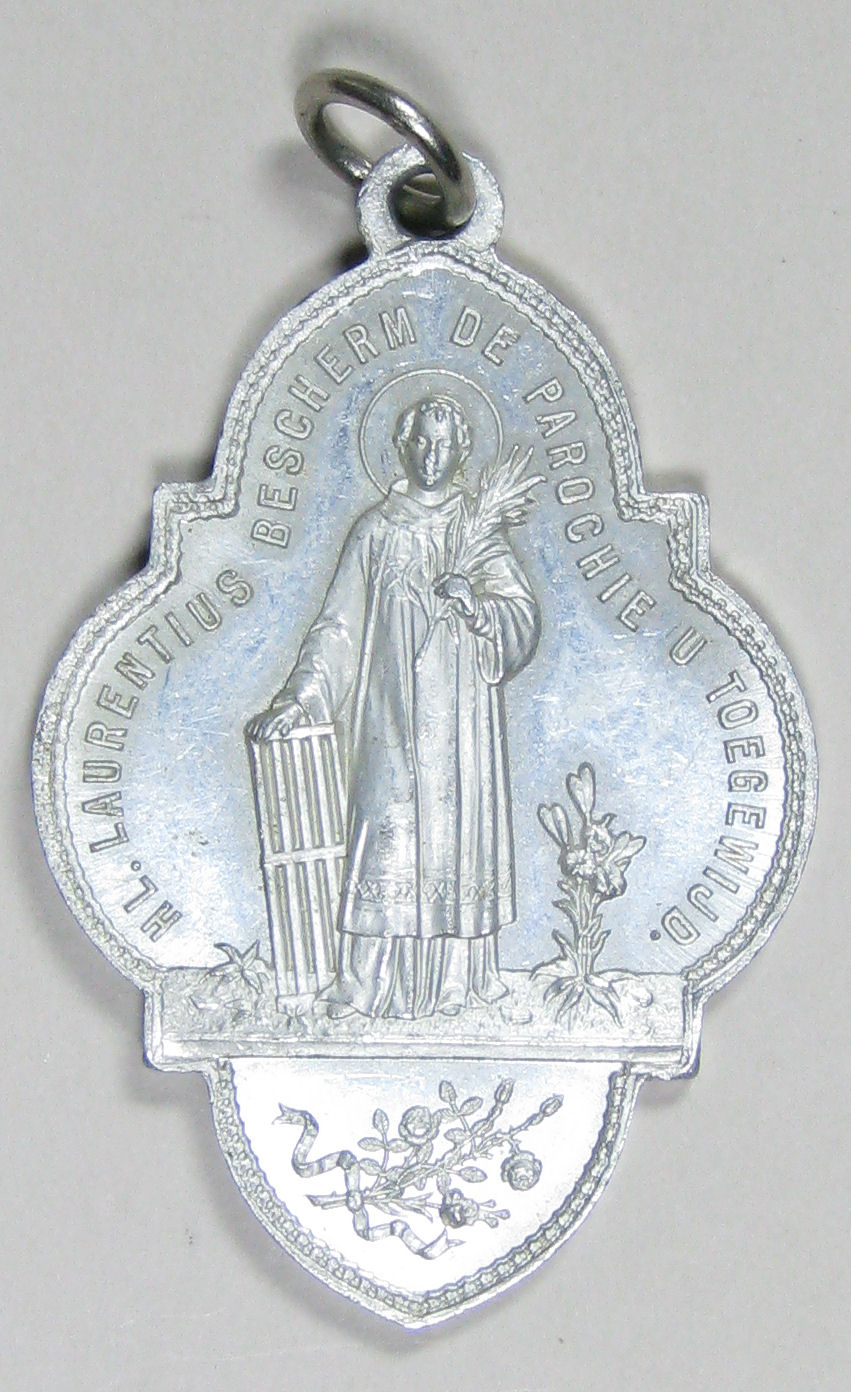 Aluminium draagpenning van de Congregatie der H. Familie Kz.: H. Laurentius, 'Hl. Laurentius bescherm de parochie u toegewijd'