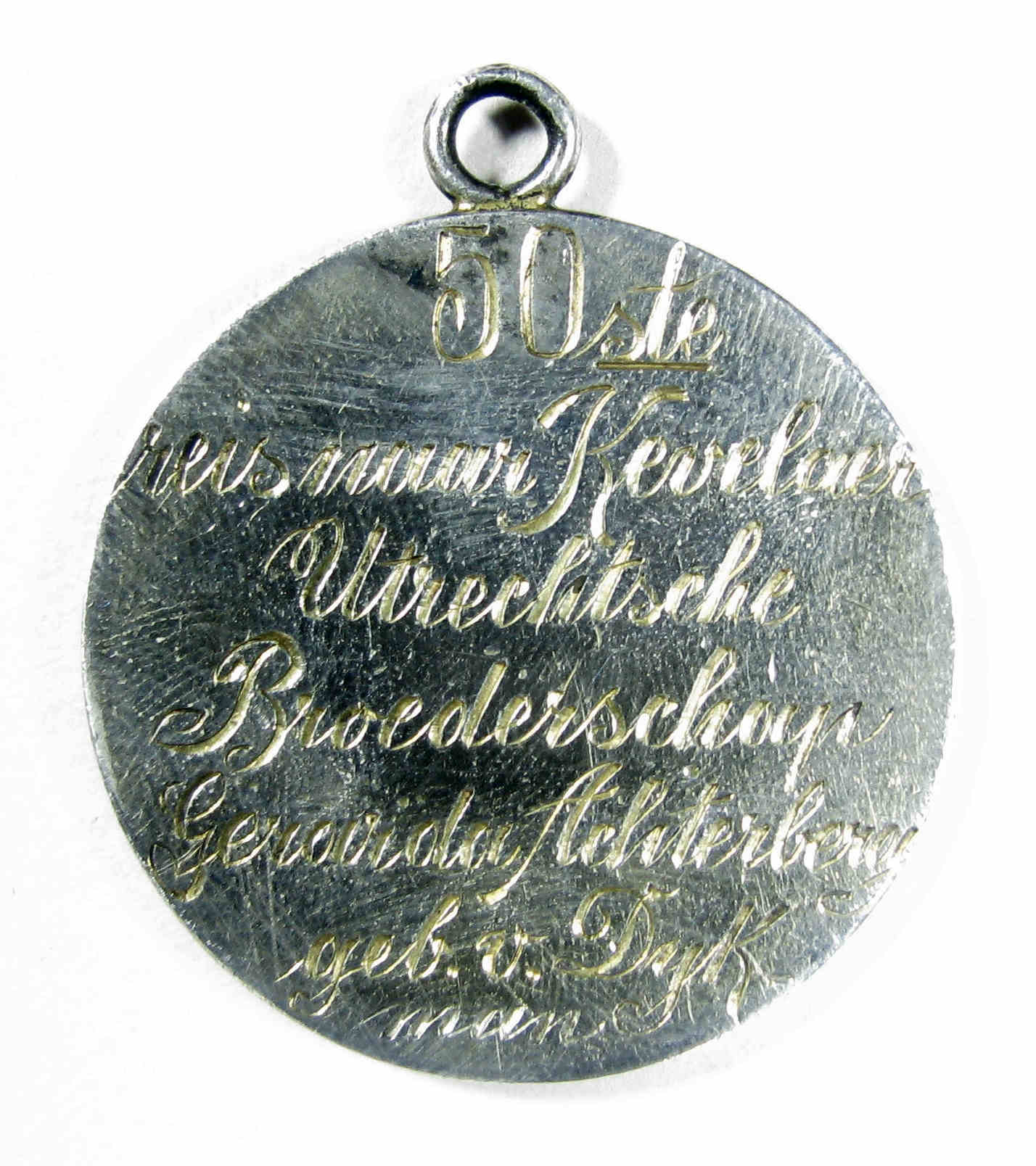 Zilveren penning ter ere van de 50ste Kevelaerbedevaart die Gerovida Achterberg maakte onder leiding van de Utrechtse Broederschap. Vz. : O.L.V. van Kevelaer temidden van twee engelen die een kroon boven haar hoofd houden, op de achtergrond een stadsgezicht (waaronder tekst: Consolatrix afflictorum ora pro nobis'), kz: Inscriptie, '50ste reis naar Kevelaer, Utrechtse Broederschap, Gerovida ...