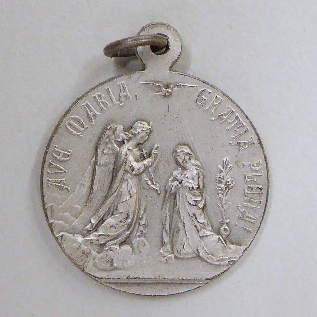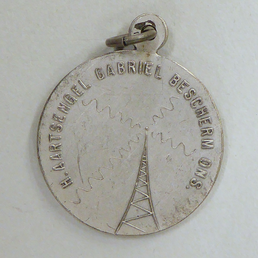 Scapuliermedaille uitgegeven door de K.R.O. met annunciatie, kz. gestileerde zendmast, radiogolven
