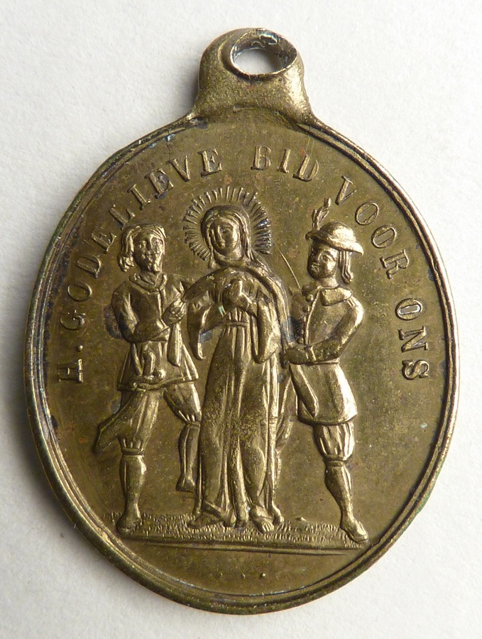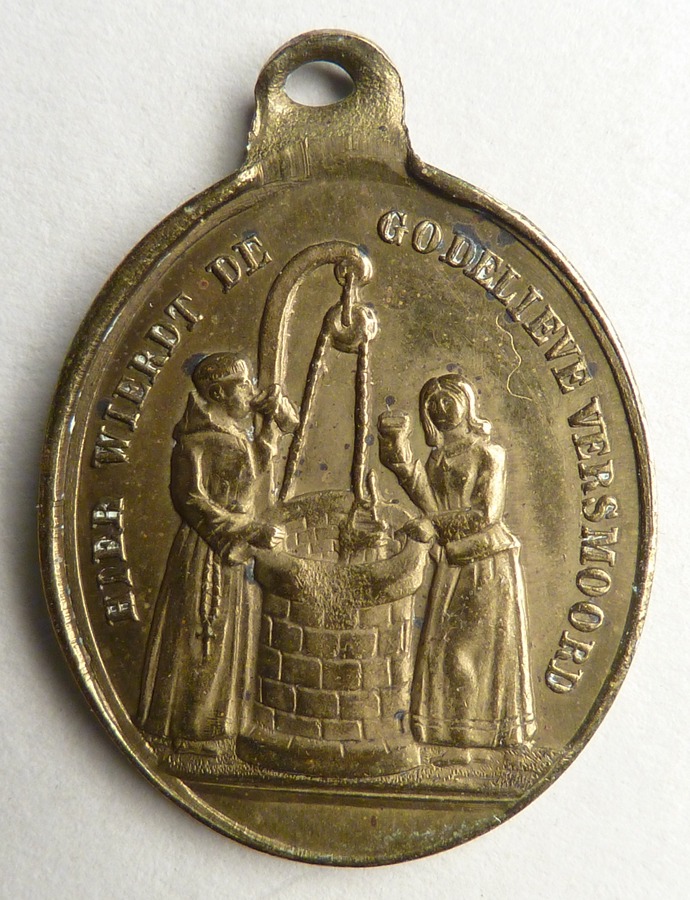 Draagpenning met wurging van H. Godelieve en tekst, kz. put met "Hier wierdt de Godelieve versmoord"
