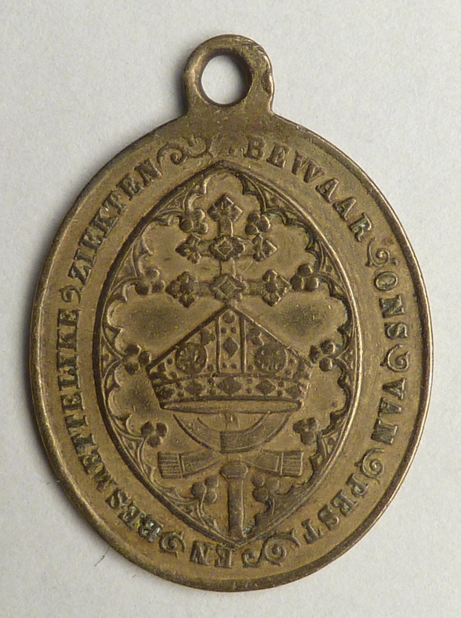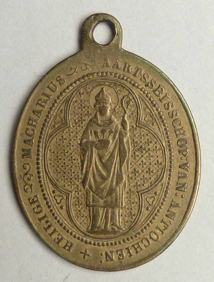 Draagpenning met H. Macharius en tekst, kz. mijter en kruisstaf met "Bewaar ons van pest en besmettelyke ziekten"