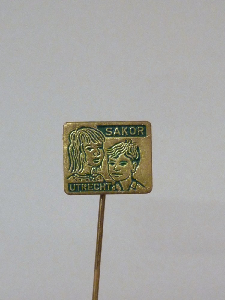 Speldje met jongen en meisje in reliëf, opschrift "Sakor Utrecht"