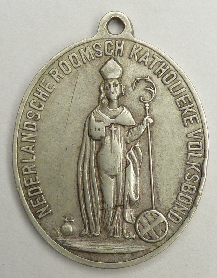 Draagpenning met H. Willibrord en "Nederlandsche roomsch katholieke volksbond", kz. met "opgericht 4 maart 1888"