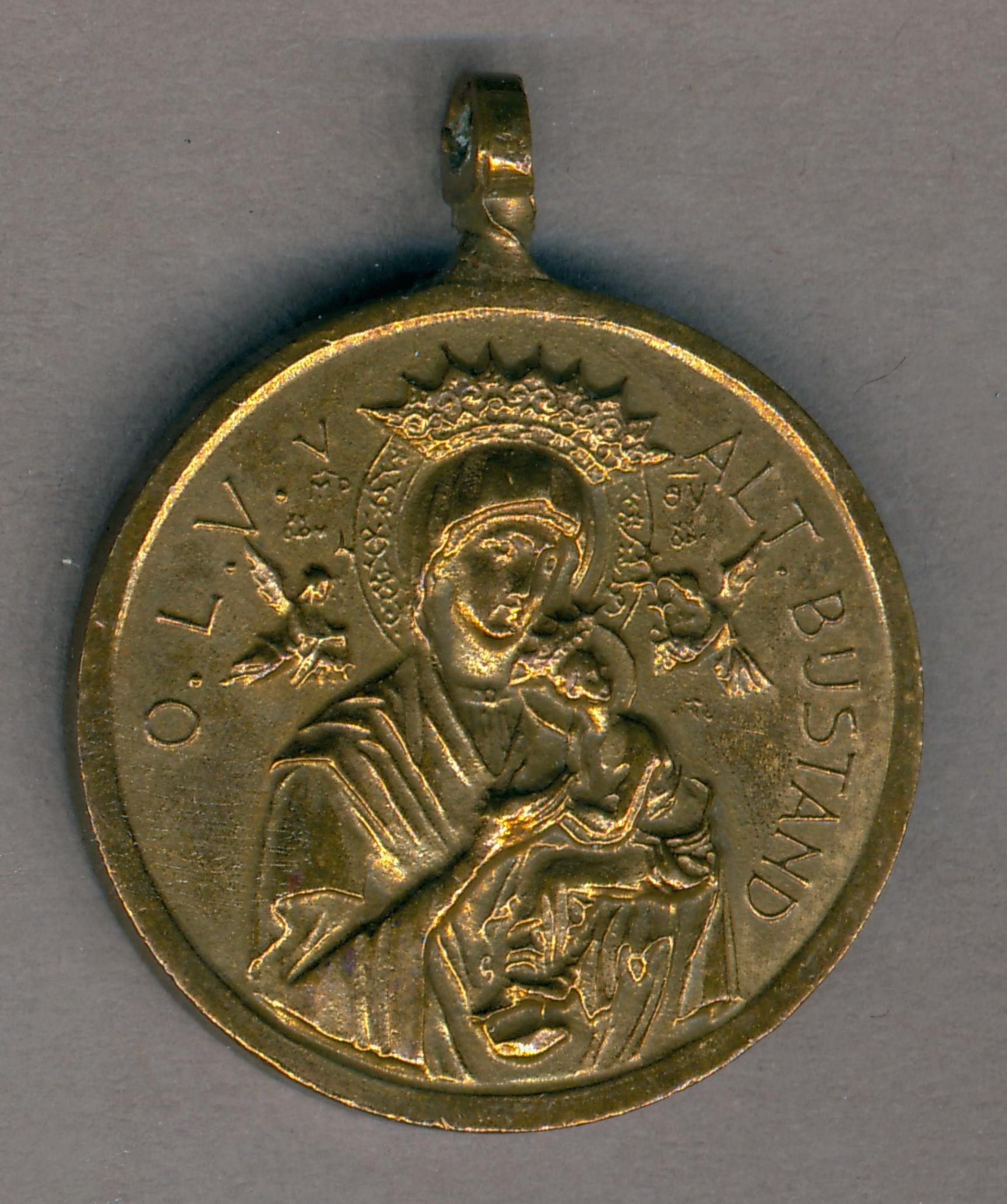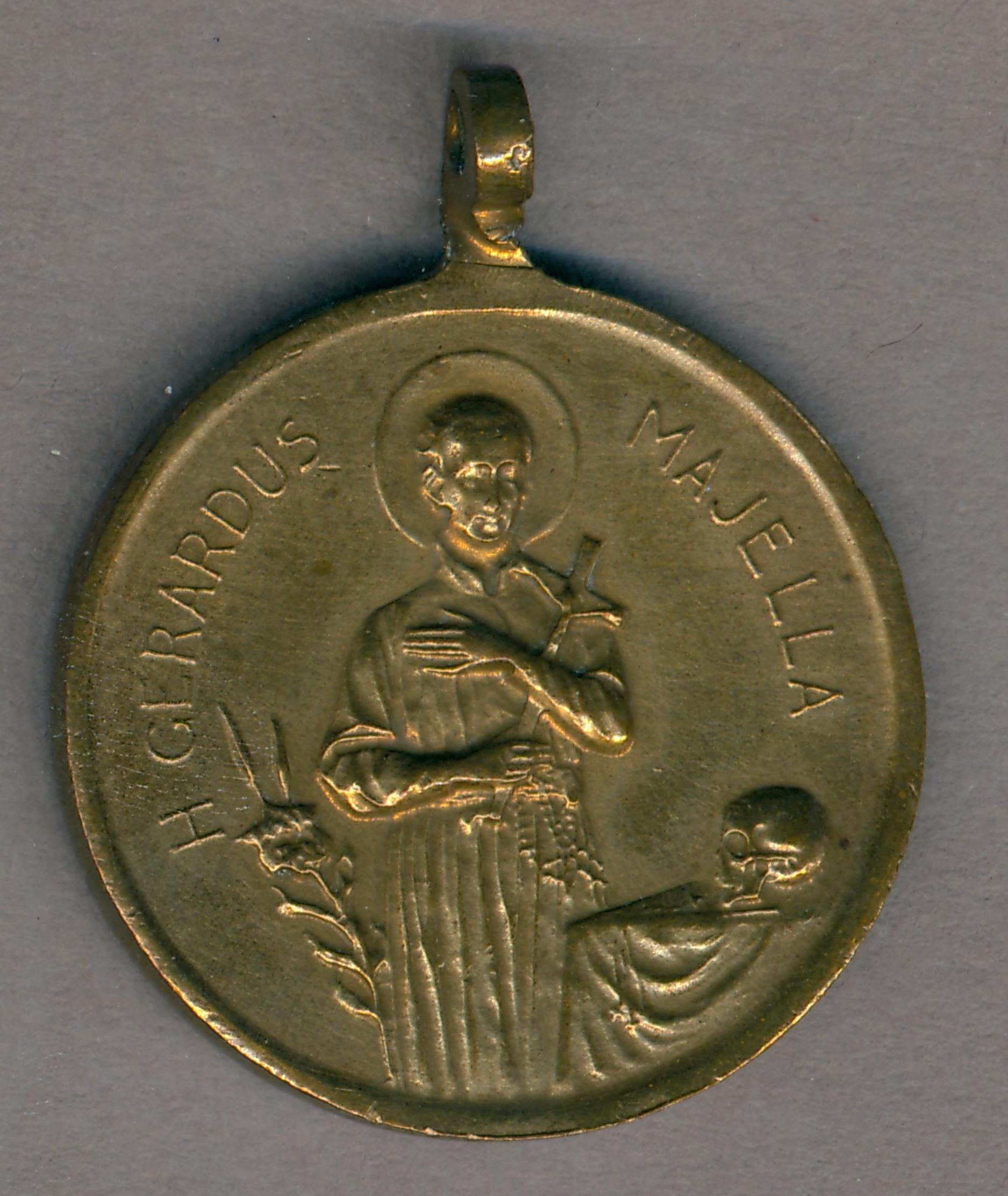 Devotiepenning met "H. Gerardus Majella" en heilige staande voor tafel met doodshoofd, kz. Maria met kind tussen twee engelen met "O.L.V. v Alt. Bijstand"
