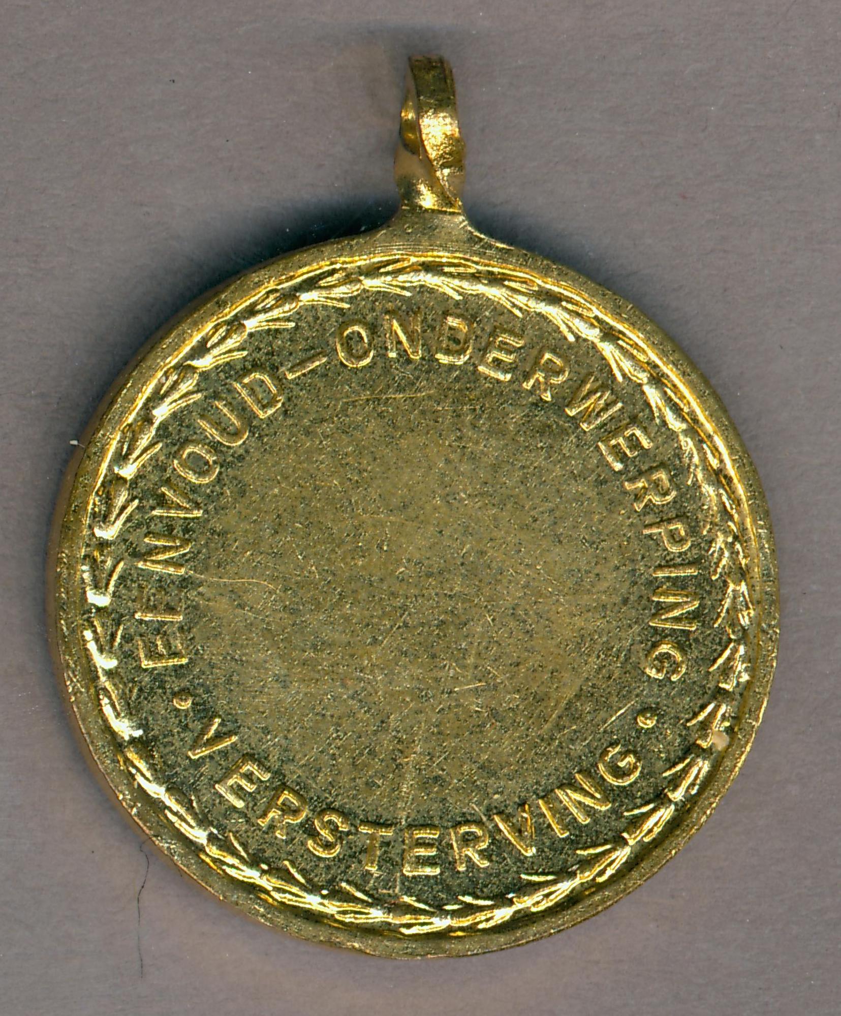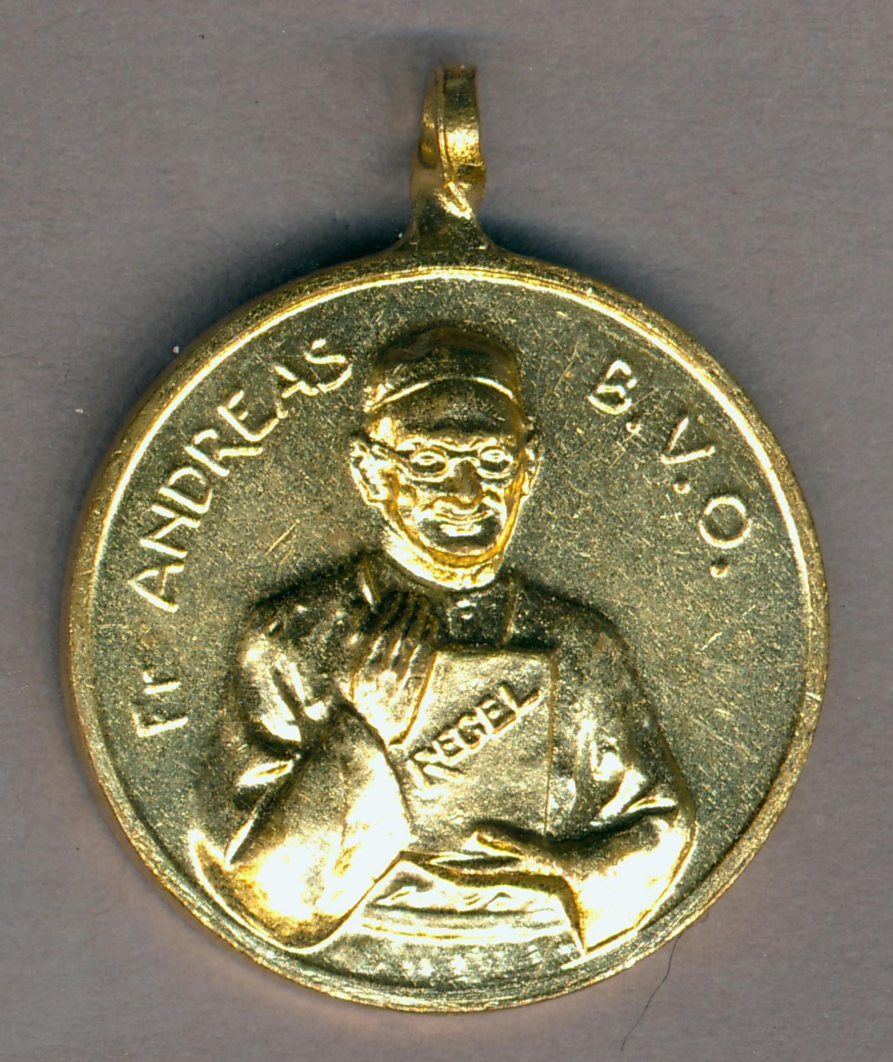 Goudkleurige devotiepenning met "Fr. Andreas B.V.O." en Andreas met 'regel', kz. met "Eenvoud onderwerping versterving"