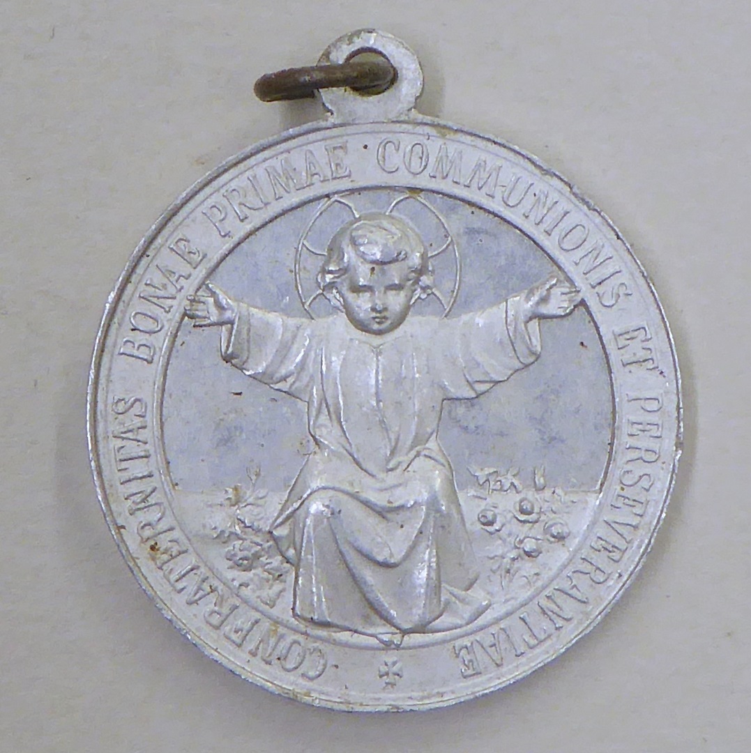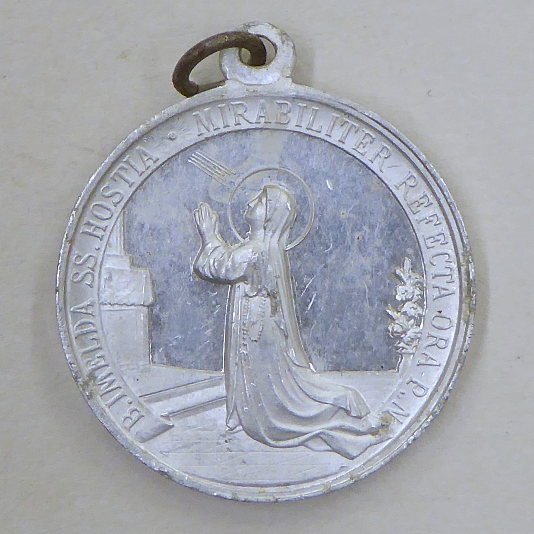 Scapuliermedaille met Christus Humilitas, kz. geknielde non voor altaar "B. Imelda..."