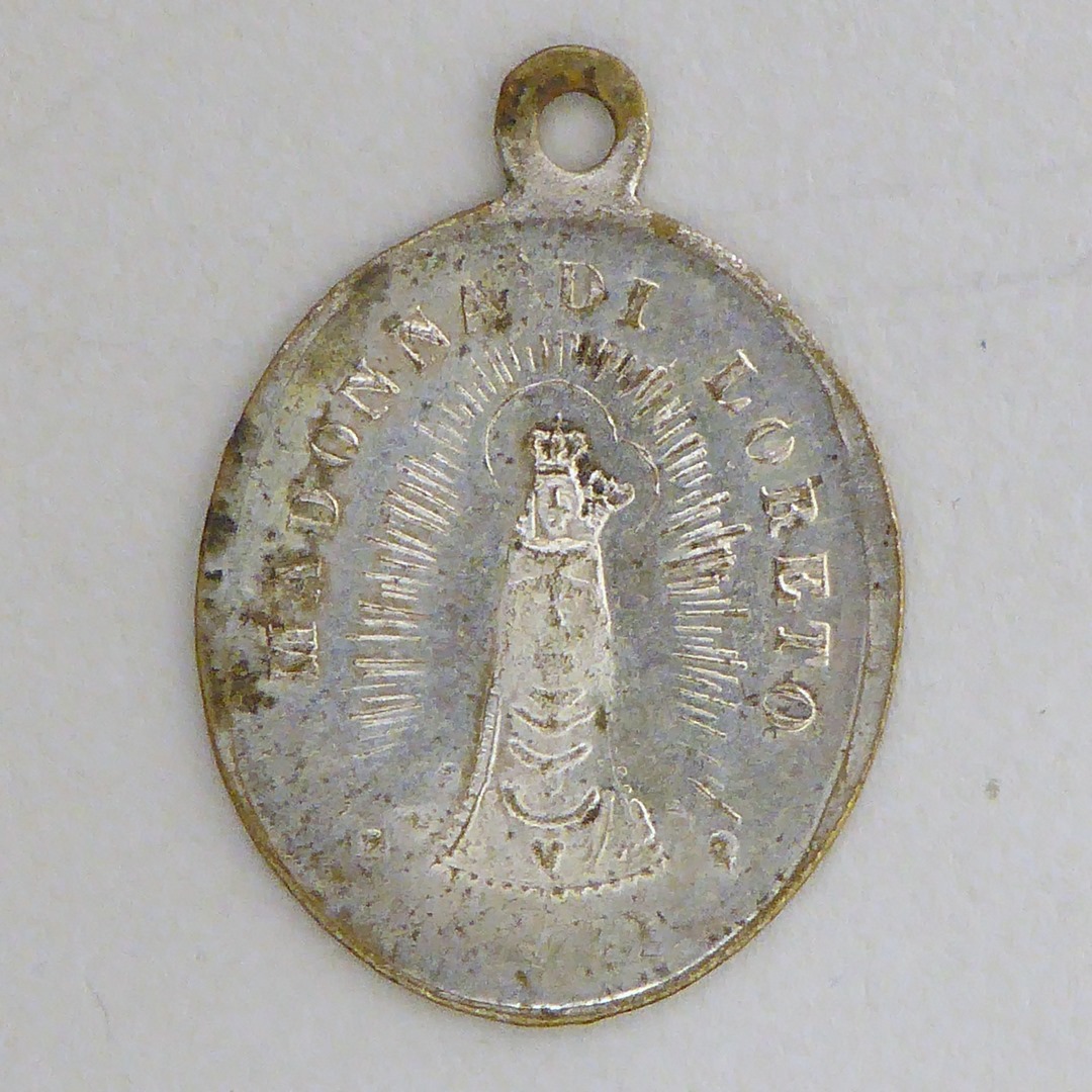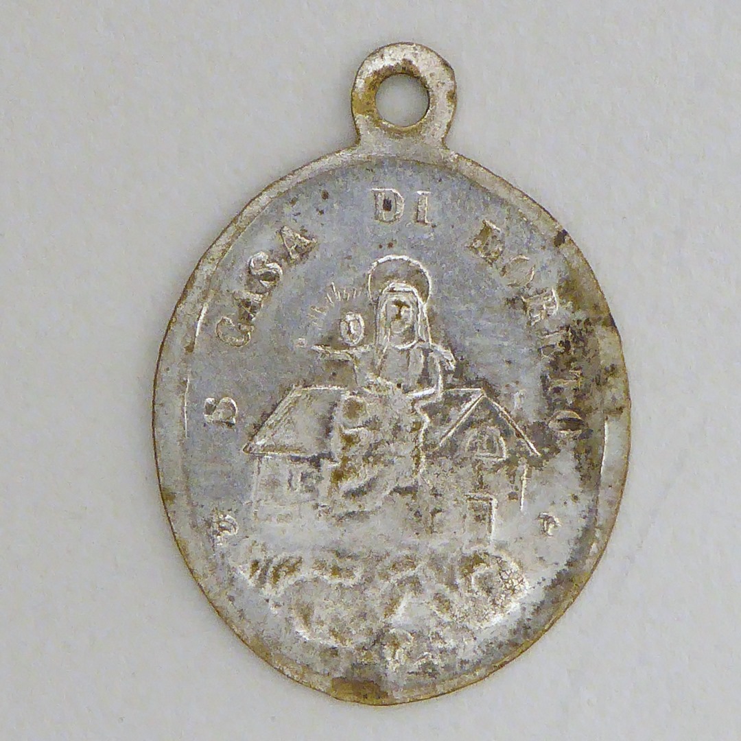 Scapulierpenning Loreto, ovaal, kz. Maria met kind gezeten op dak huis "S. Casa di Loreto"