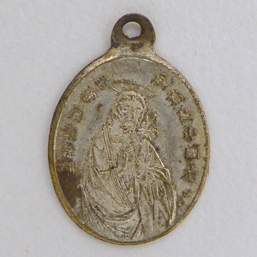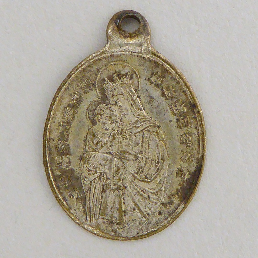 Scapulierpenning, ovaal, met halffiguur Christus, oosterse karaktertekens, kz. halffiguur Maria