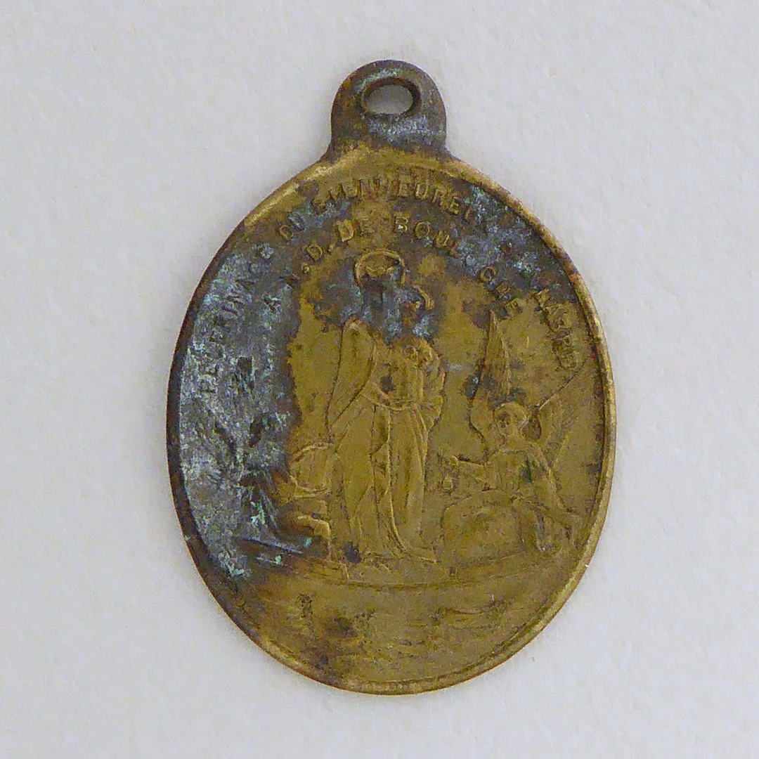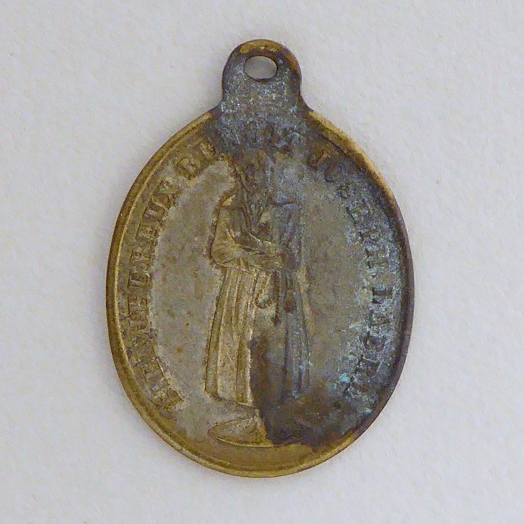 Scapulierpenning, ovaal, zalige Joseph Labre, kz. Maria met kind in bootje