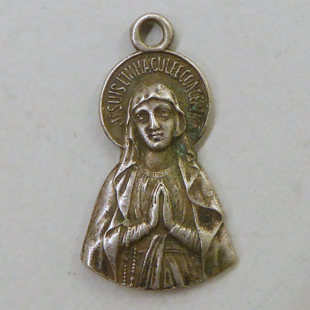 Scapulierpenning met biddende Maria, kz. verschijning O.L.V. van Lourdes en tekst
