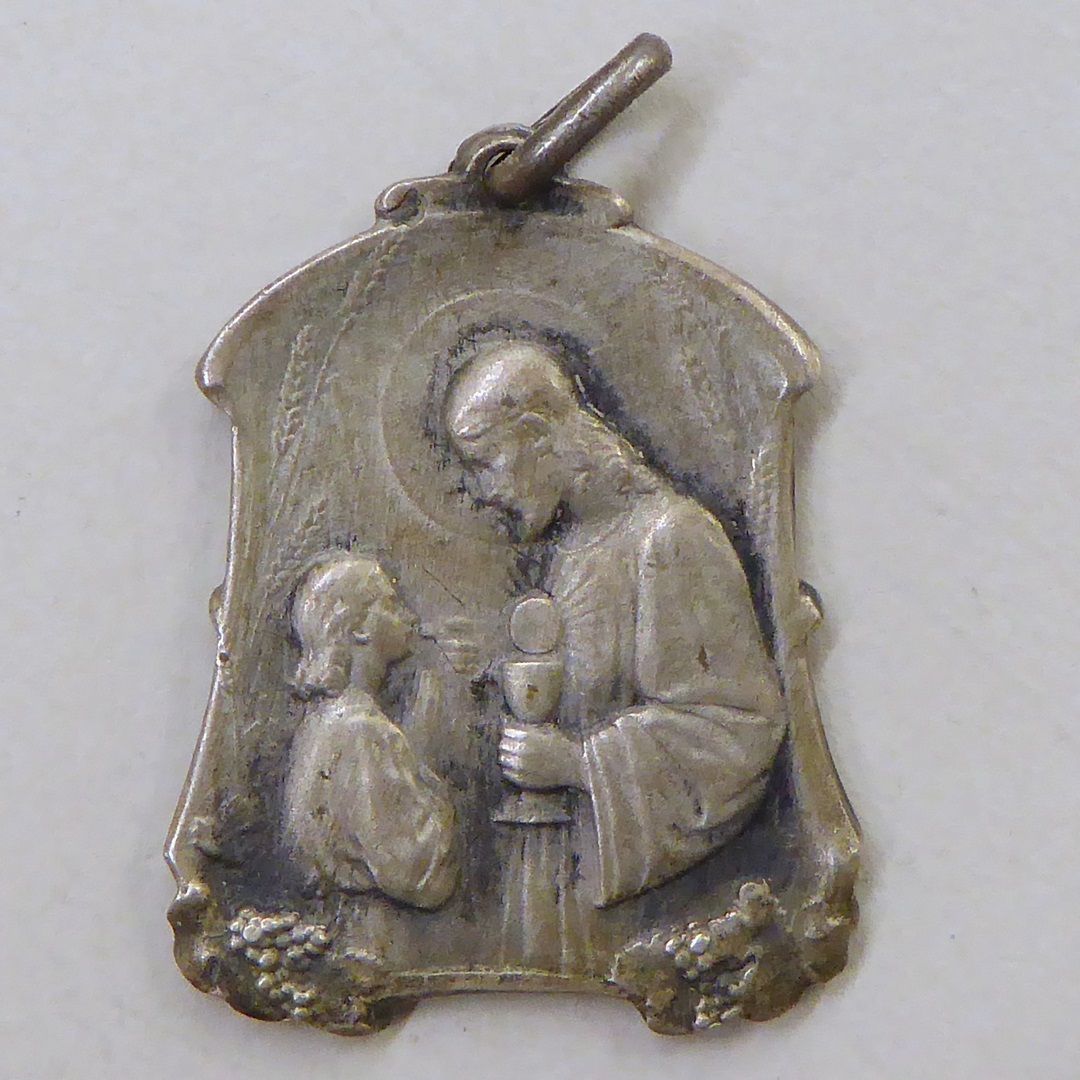 Scapulierpenning met Christus hostie uitreikend aan kind, kz. bloemen