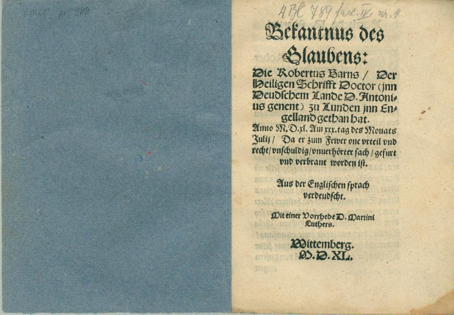 Bekantnus des Glaubens: Die Robertus Barns, Der Heiligen Schrifft Doctor (jnn Deudschem Lande D. Antonius genent) zu Lunden jnn Engelland gethan hat, Anno M.D.xl. Am xxx. tag des Monats Julij, Da er zum Fewer, one vrteil vnd recht, unschuldig, vnuerhörter sach, gefürt vnd verbrant worden ist. Aus der Englischen sprach verdeudscht. Mit einer Vorrhede D. ...