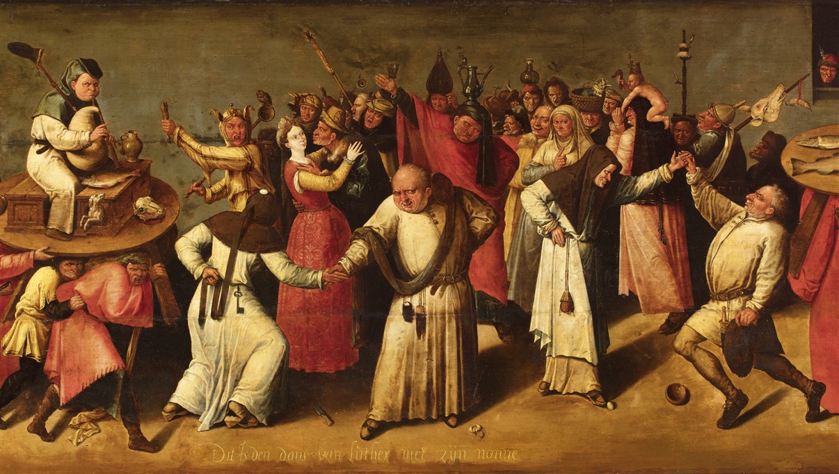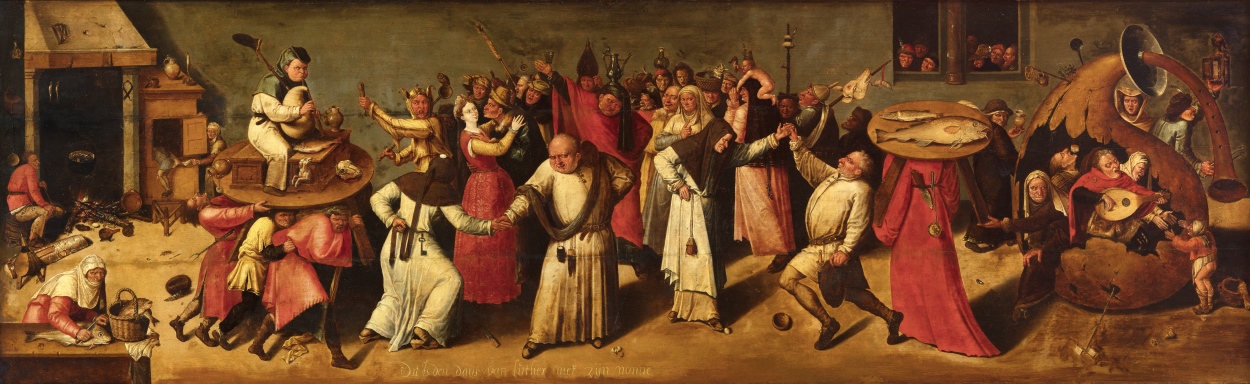 In een interieur met links een haard is de losbandigheid van het carnaval voorgesteld tegenover de karige vasten. Van links en rechts worden twee tafels binnengedragen die dienst doen als troon van respectievelijk het carnaval, een doedelzakspelende nar, en de vasten, de vissen. In het midden danst een groep carnavalsvierders. Op de voorgrond dansen twee ...