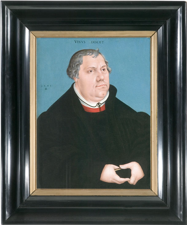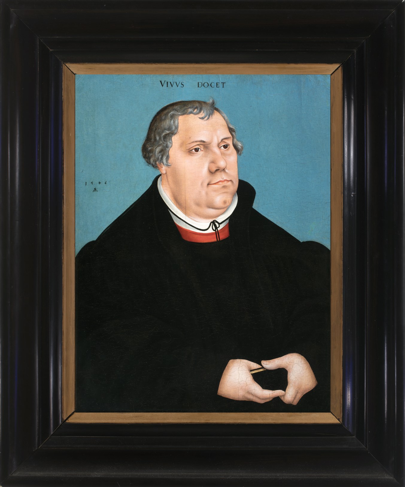 Middenboven het opschrift: VIVVS DOCET (Hij onderwijst tijdens zijn leven). Links het jaartal 1546 en het vignet dat zowel door Lucas Cranach de Oude als de Jonge (1515-1586) werd gebruikt: een gevleugeld slangetje naar links gewend met een ringetje in de bek.