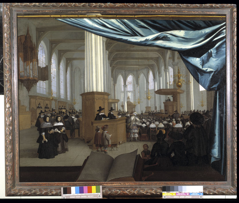 Zicht van west naar oost binnen de Amsterdamse Nieuwezijdskapel tijdens de dienst van achter een balustrade waarop een open boek, met op het voorste plan een als trompe-l'oeuil geschilderd gordijn, dat met ringen bevestigd aan een horizontale stang. Het interieur toont een driebeukige kerk met bundelpijlers, trekbalken, koperen luchters en een vloer die belegd is ...