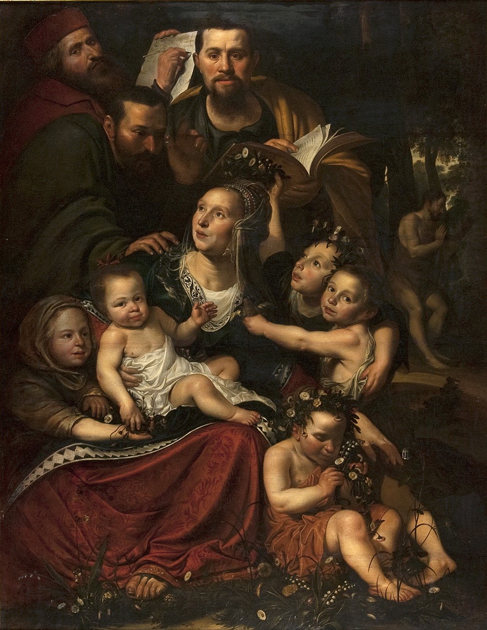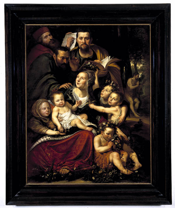Gesigneerd en gedateerd op het schrijfpapier dat de figuur linksboven (een zelfportret van de schilder) vasthoudt:Ick / heb dit [voltooid] int Iaer ons / heeren 1623 (23 slecht leesbaar) [den 10] September / In Amstelredam. Op de achtergrond Johannes de Doper, onderdeel van de Prediking van Johannes de Doper die grotendeels verloren is gegaan toen ...