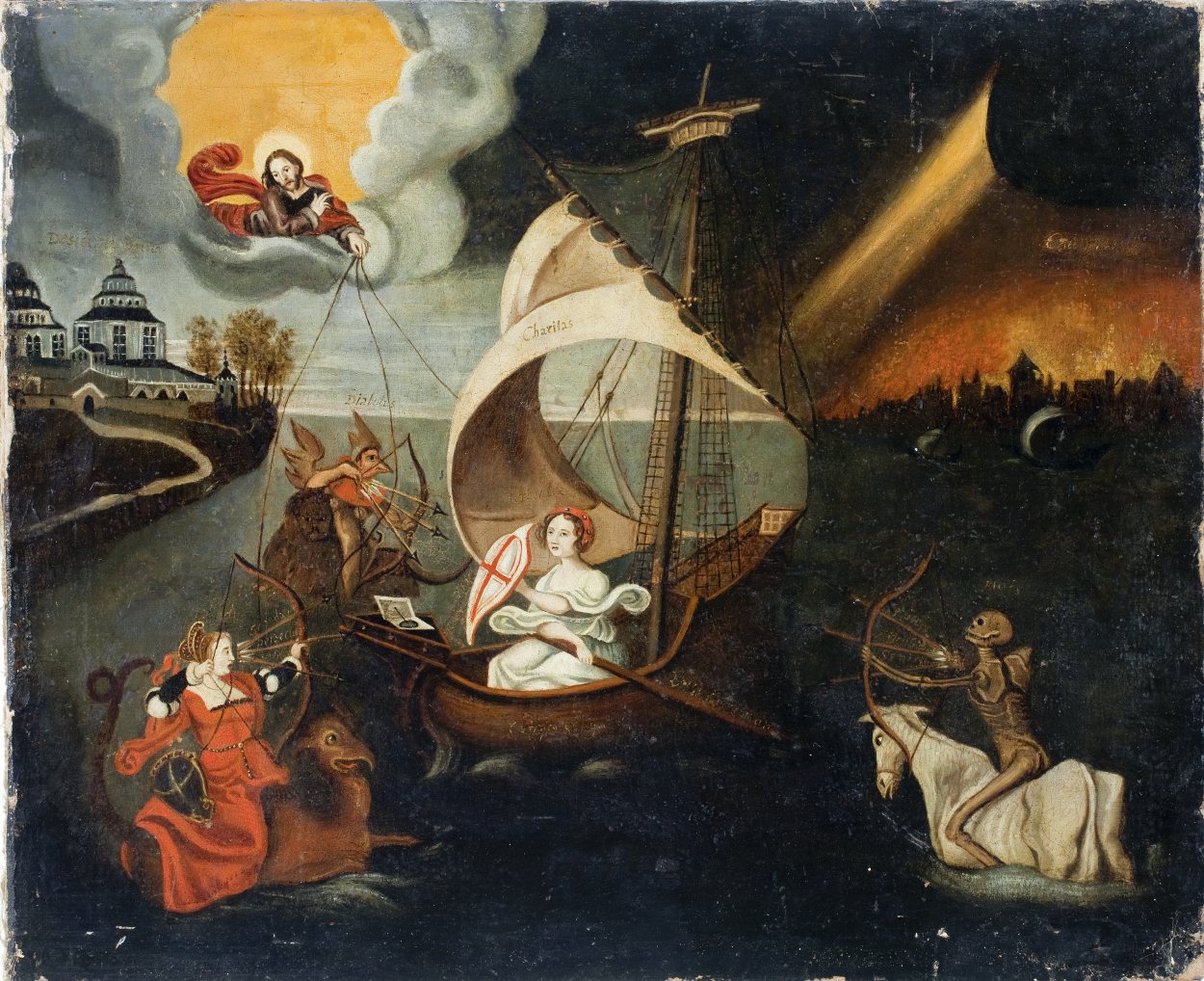Het schip met Patientia (Volharding) draagt in het zeil het opschrift Charitas (Liefde) en op de steven C[....] sangui. Bij Patientia’s schild het woord Fides (Geloof) en op haar roeispaan Vita Christiana (Het christelijk leven). Diabolus (Duivel), Mundus (Wereld) en Mors (Dood) richten ieder een boog met drie pijlen op Patientia waarop bij Diabolus de ...