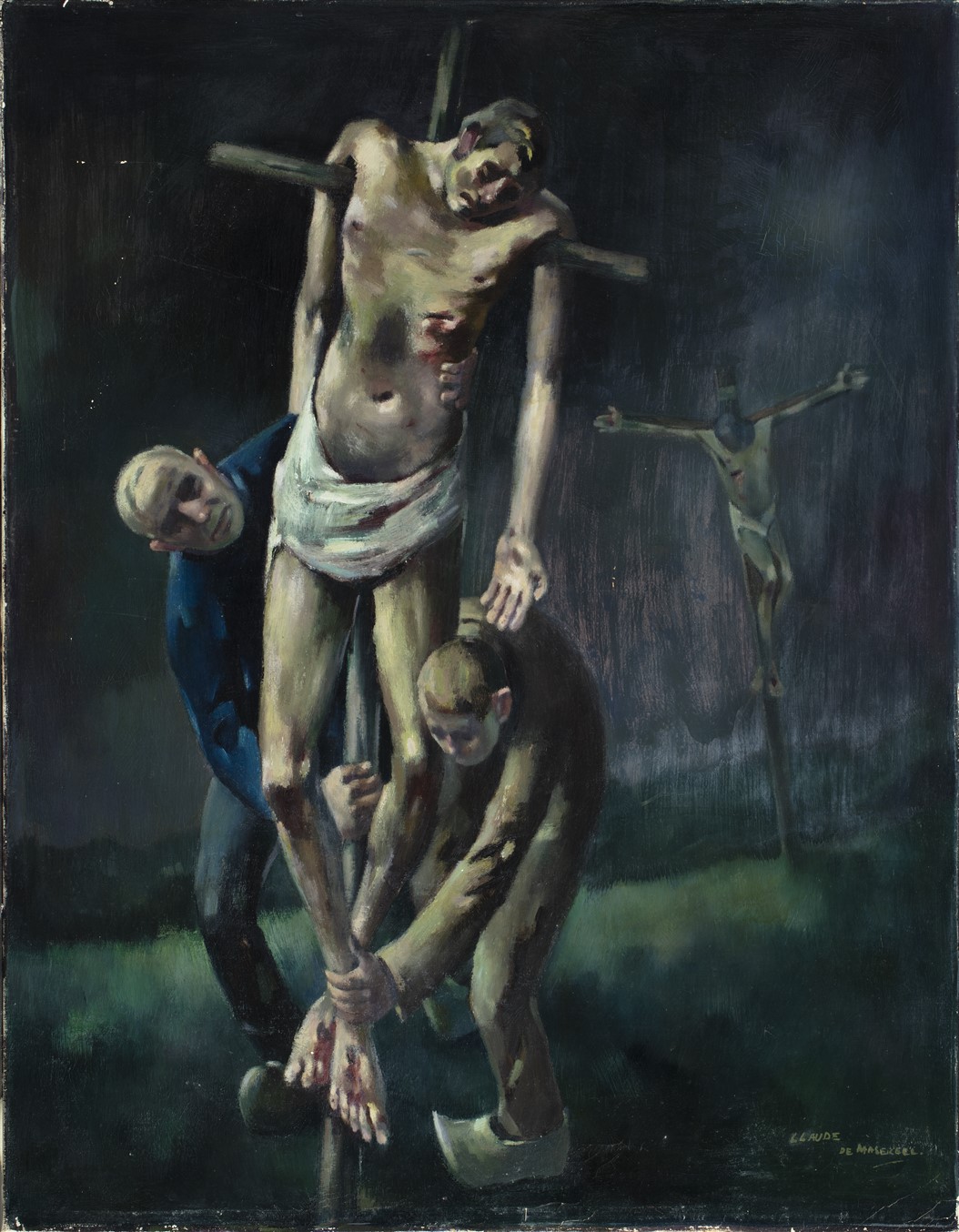 Gesigneerd rechtsonder: CLAUDE / DE MASEREEL. Op de achtergrond de gekruisigde Christus.