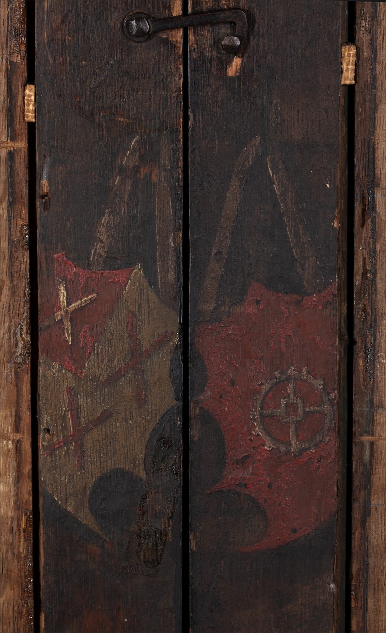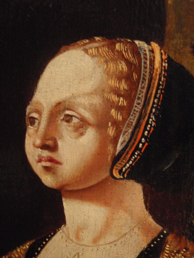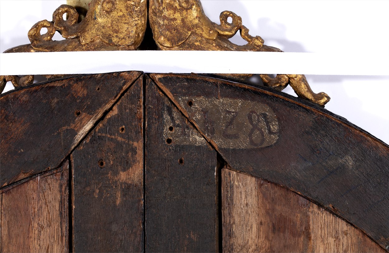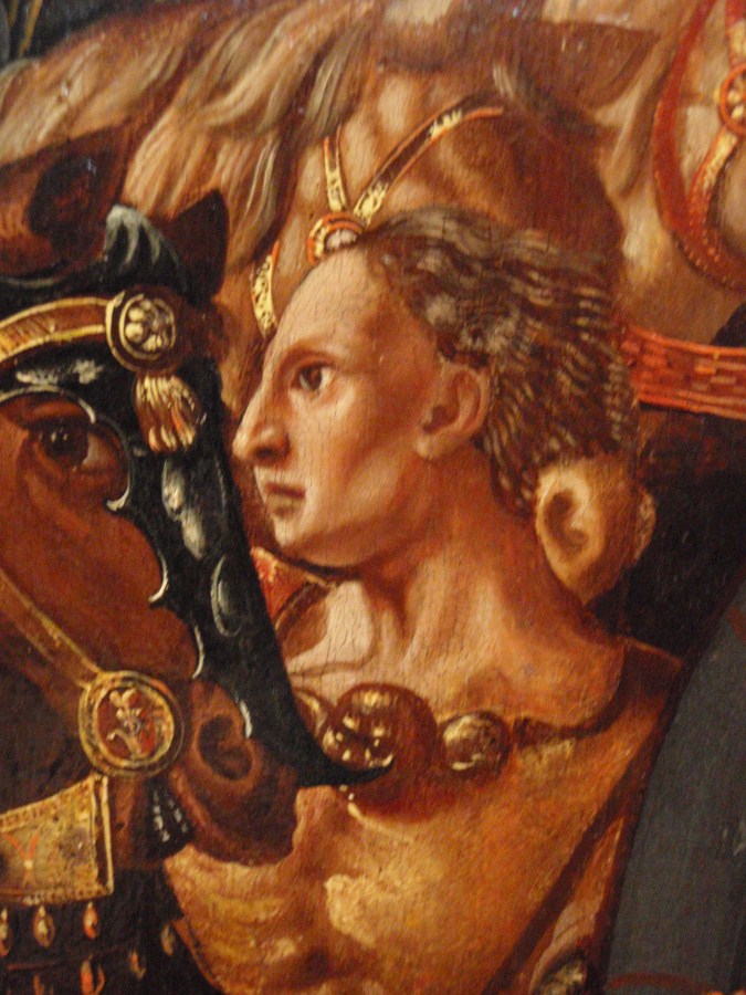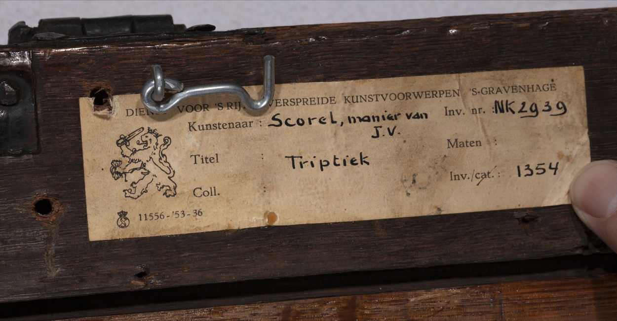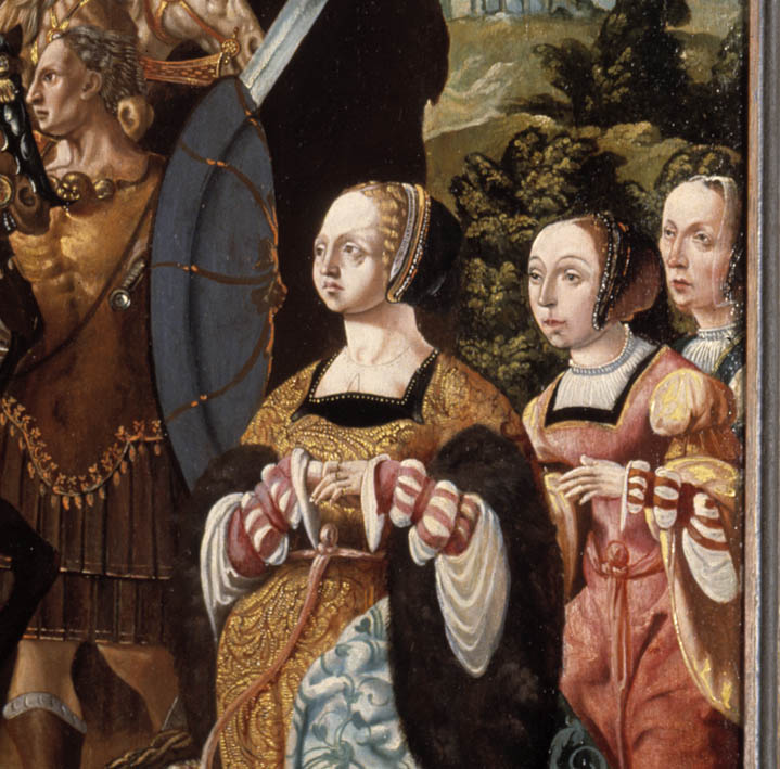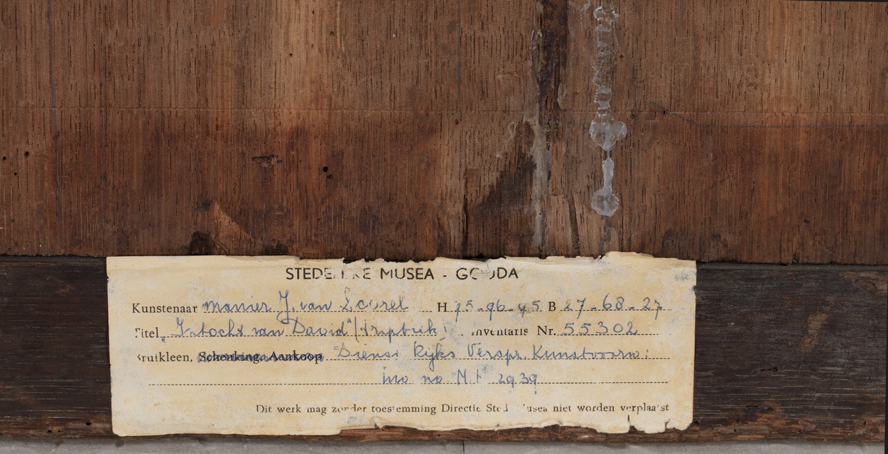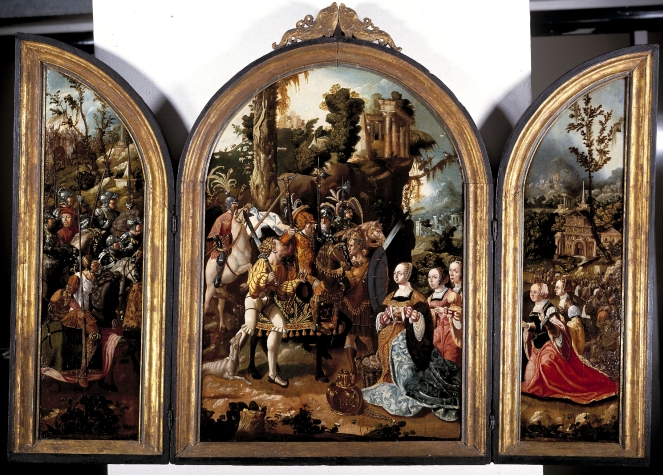 De voorstellingen op het middenpaneel en de zijpanelen vormen een geheel. In een bergachtige omgeving met antieke ruïnes heeft de ontmoeting tussen David en Abigaïl plaats (1 Sam. 25:2-35). Het middenpaneel toont David te paard, begeleid door drie ruiters en, te voet, een schildknaap en een soldaat. Op de kruik op de voorgrond van het ...