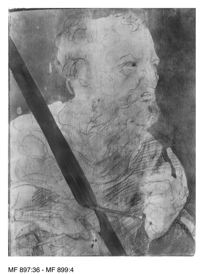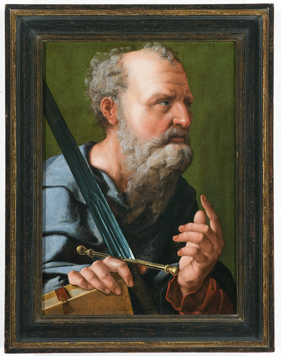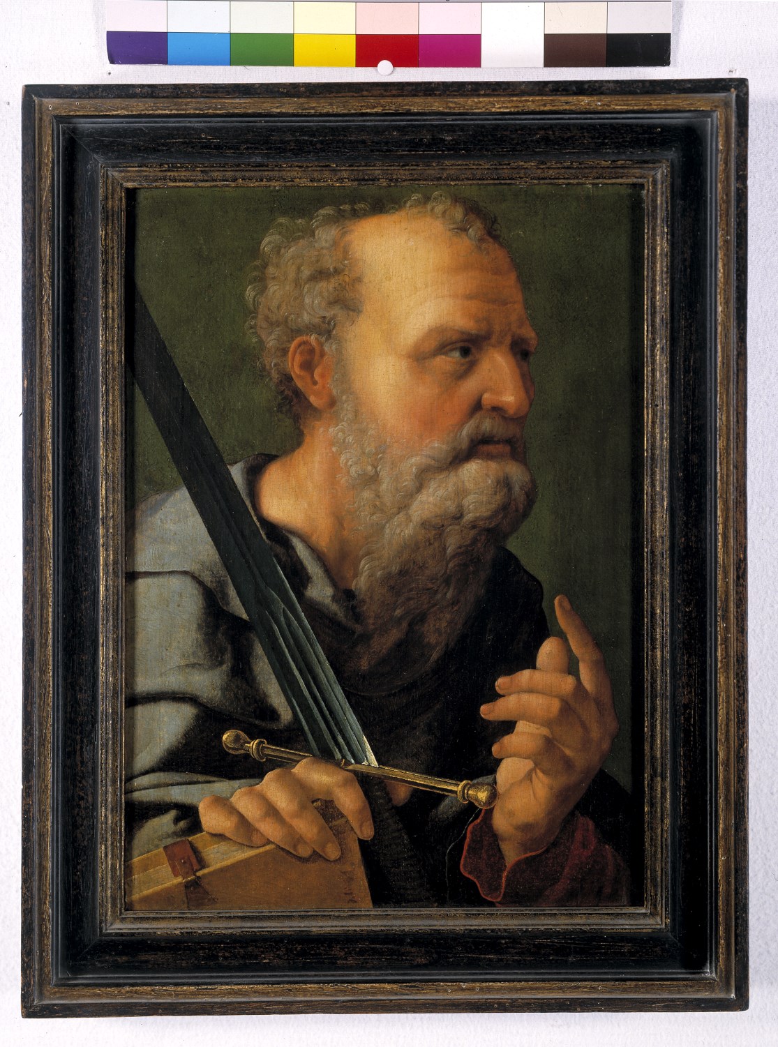 De apostel Paulus is als borststuk driekwart naar rechts gewend weergegeven tegen een groene achtergrond. Hij is kalend voorgesteld met een halflange baard. Met zijn linker hand wijst hij omhoog. In de rechter hand houdt hij zijn zwaard en boek. Op het boek zijn de letters 'V o(e?)re' (fragment van een signatuur?) te onderscheiden.