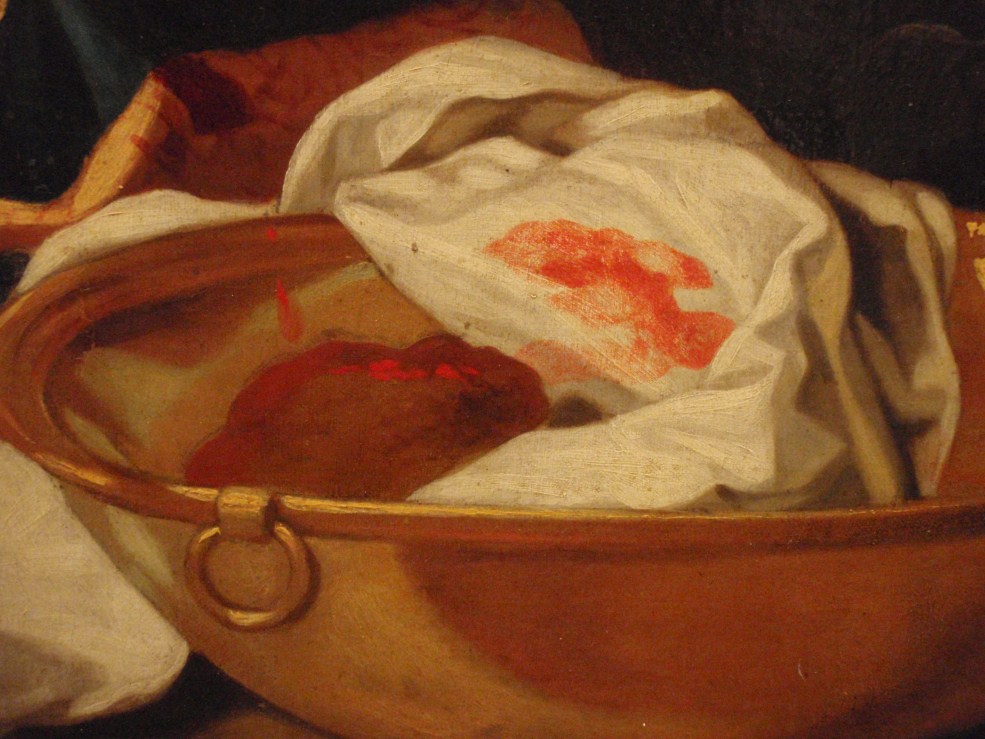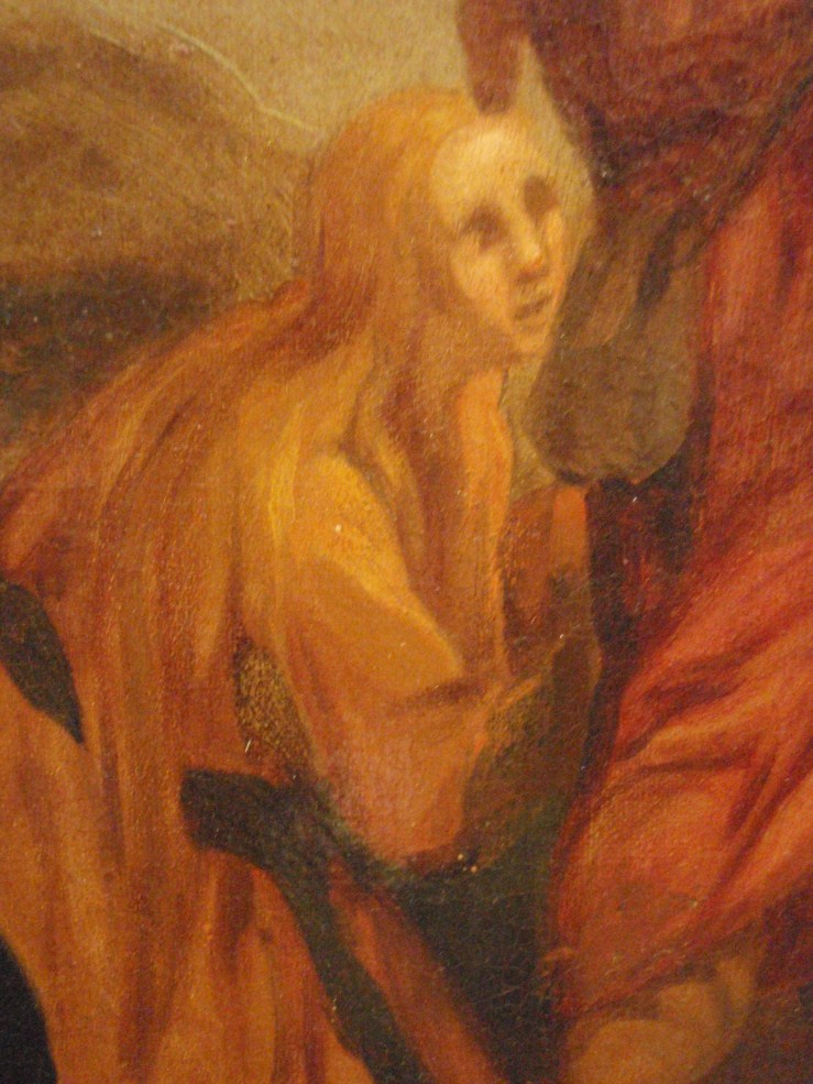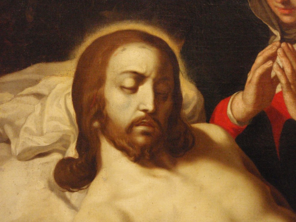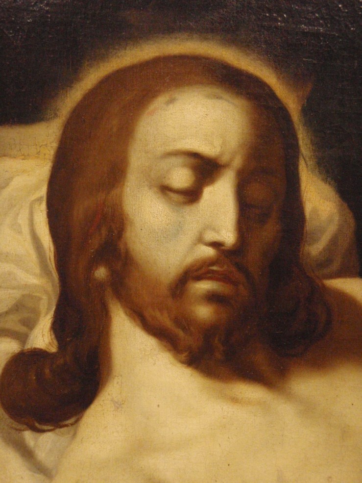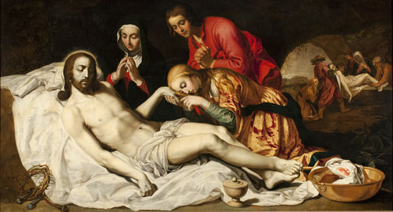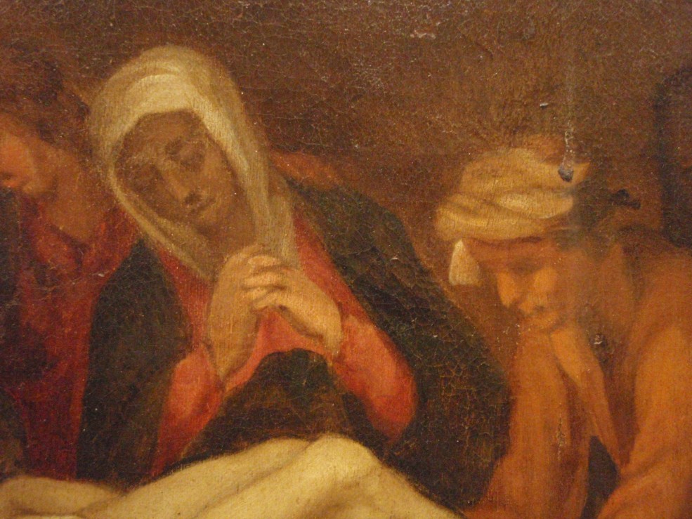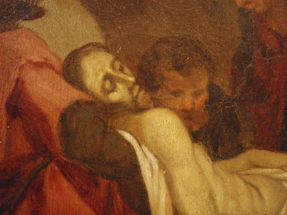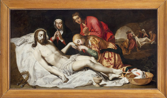 Op de achtergrond rechts de Graflegging. Atelierrepliek van Abraham Bloemaerts gesigneerde Bewening (Rotterdam, Museum Boijmans-Van Beuningen, inv. nr. 2062; Roethlisberger 1993, cat. nr. 390, afb. 551).