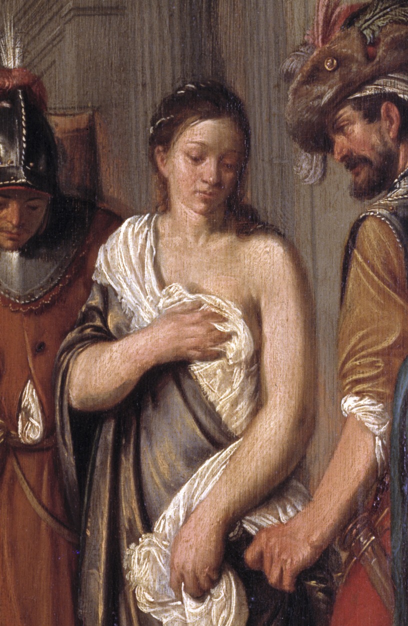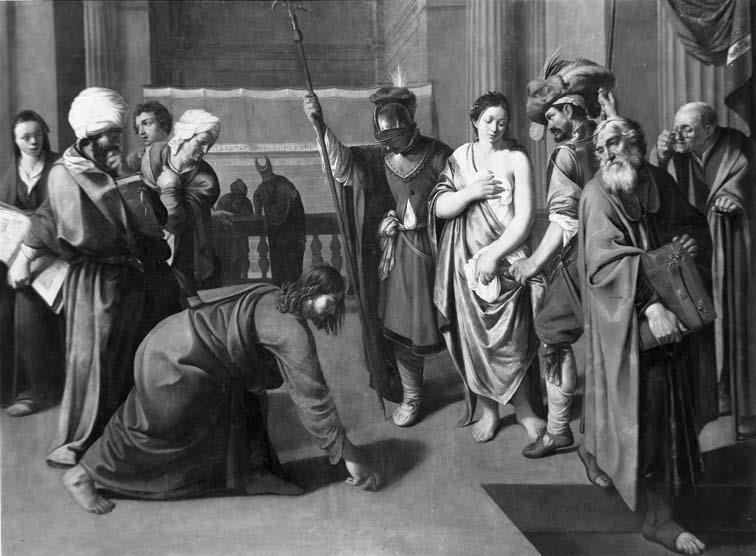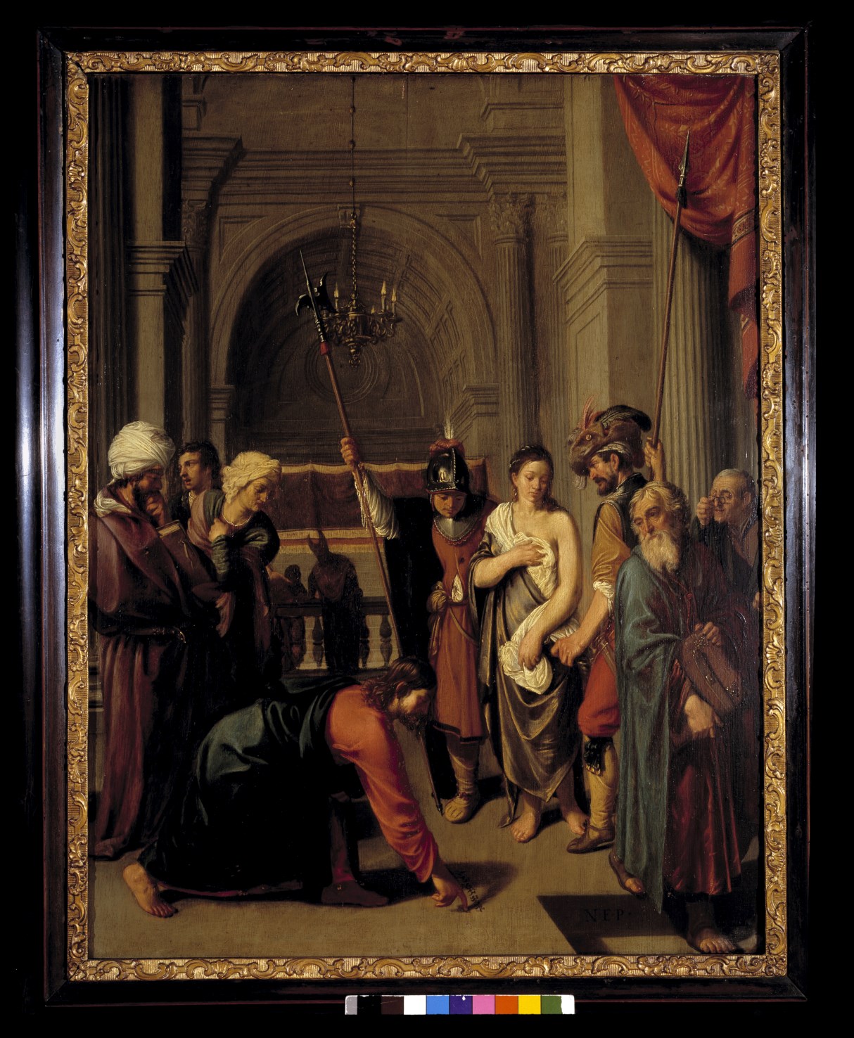 Op de plint rechtsonder gemonogrammeerd: N•E•P. De door Christus op de tempelvloer geschreven pseudo-Hebreeuwse letters verwijzen naar de tekst die hij bij deze gelegenheid sprak: wie van u zonder zonde is werpe de eerste steen. Het schilderij is mogelijk een voorstudie voor een grotere, door Pickenoy voluit gesigneerde versie met dit thema (Aken, Suermondt-Ludwig-Museum; zie ...