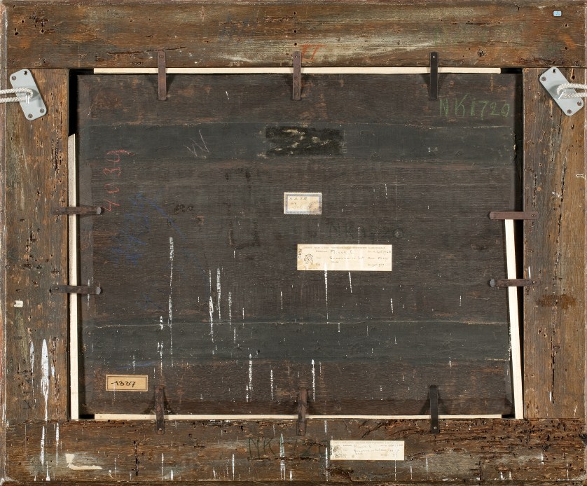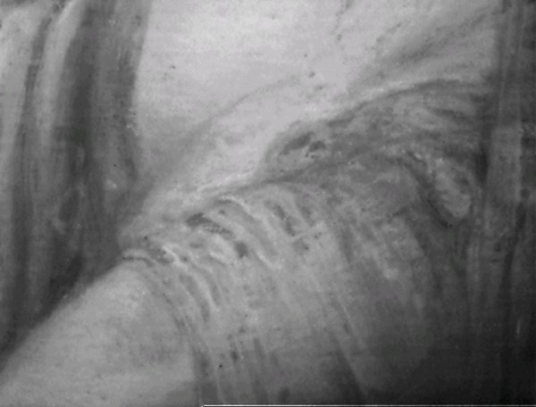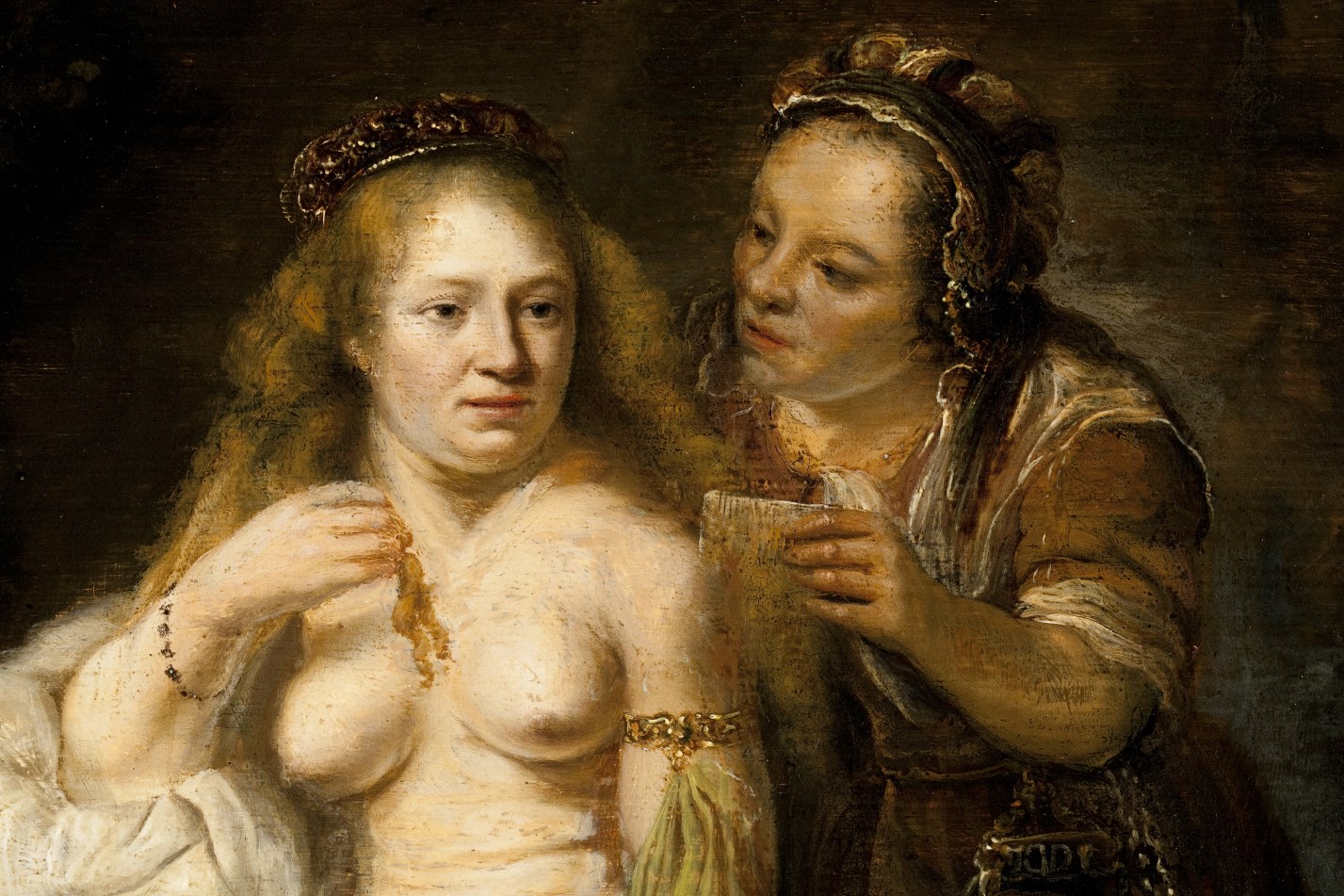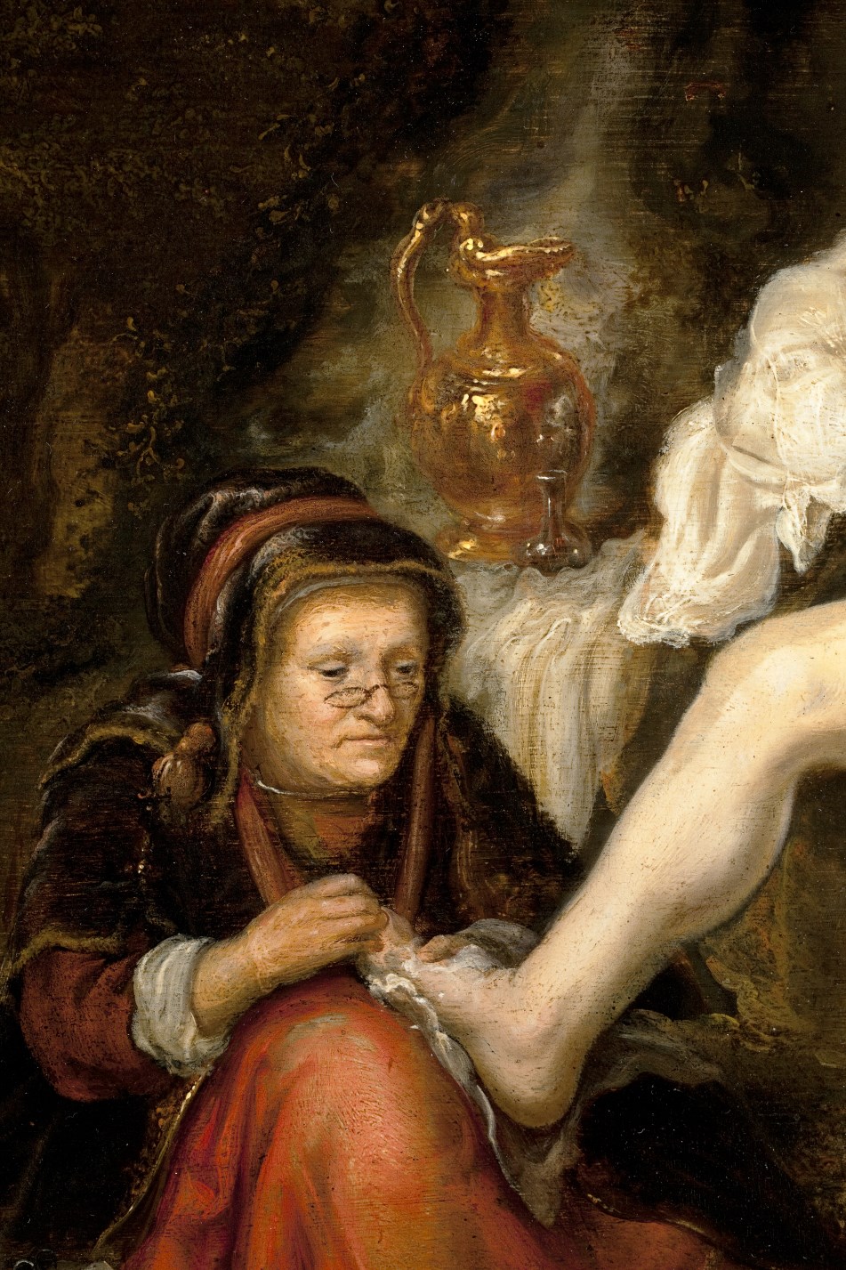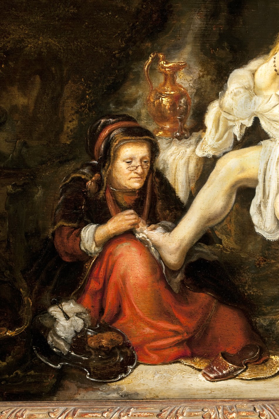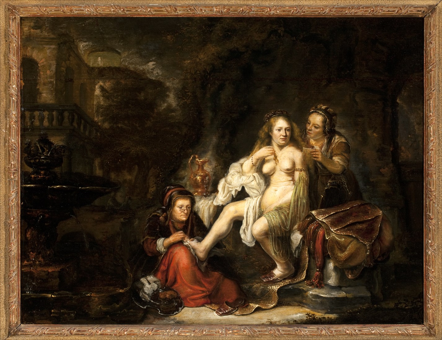 Op de stenen bank onder de kledingstukken rechts van Bathseba de restanten van een signatuur.
