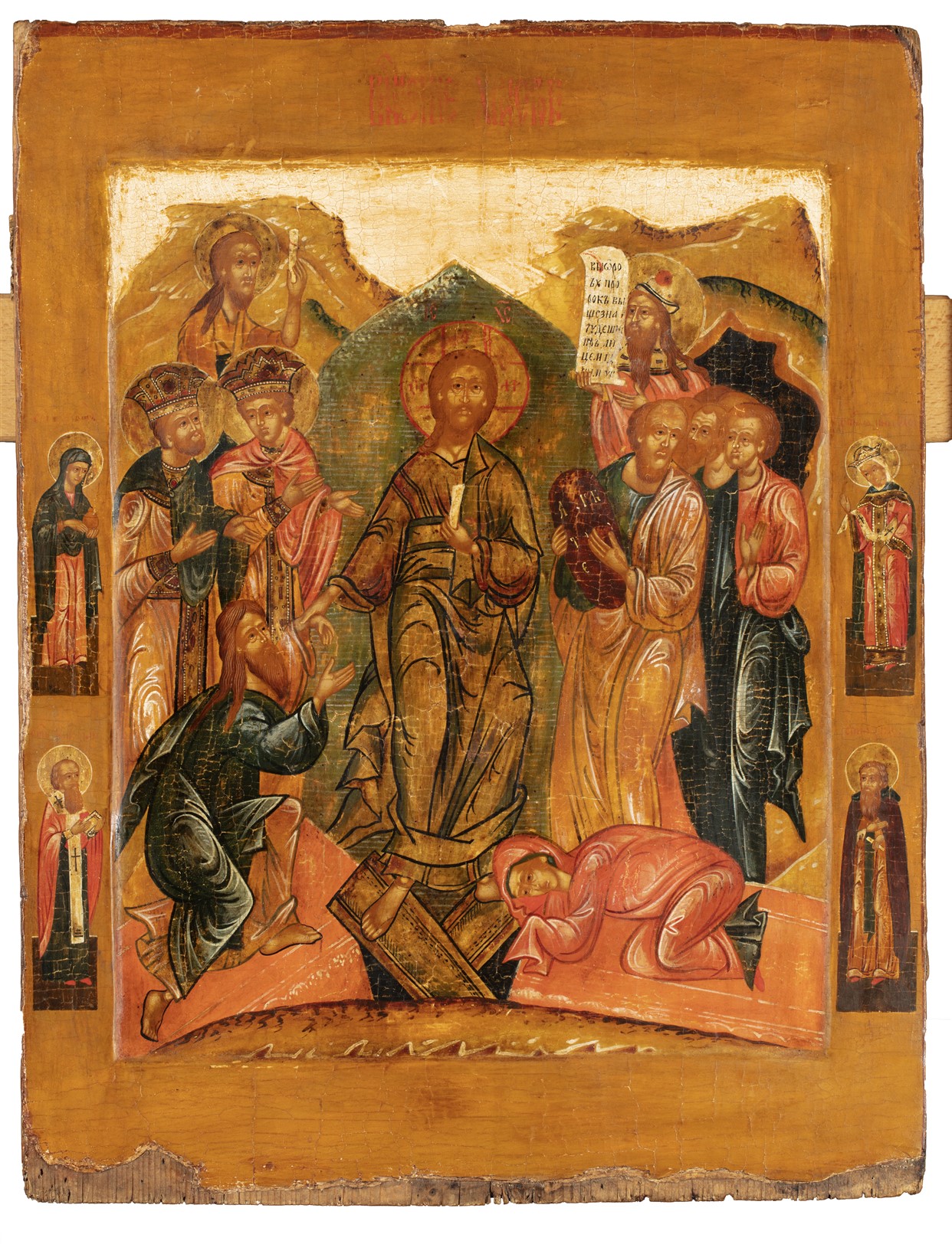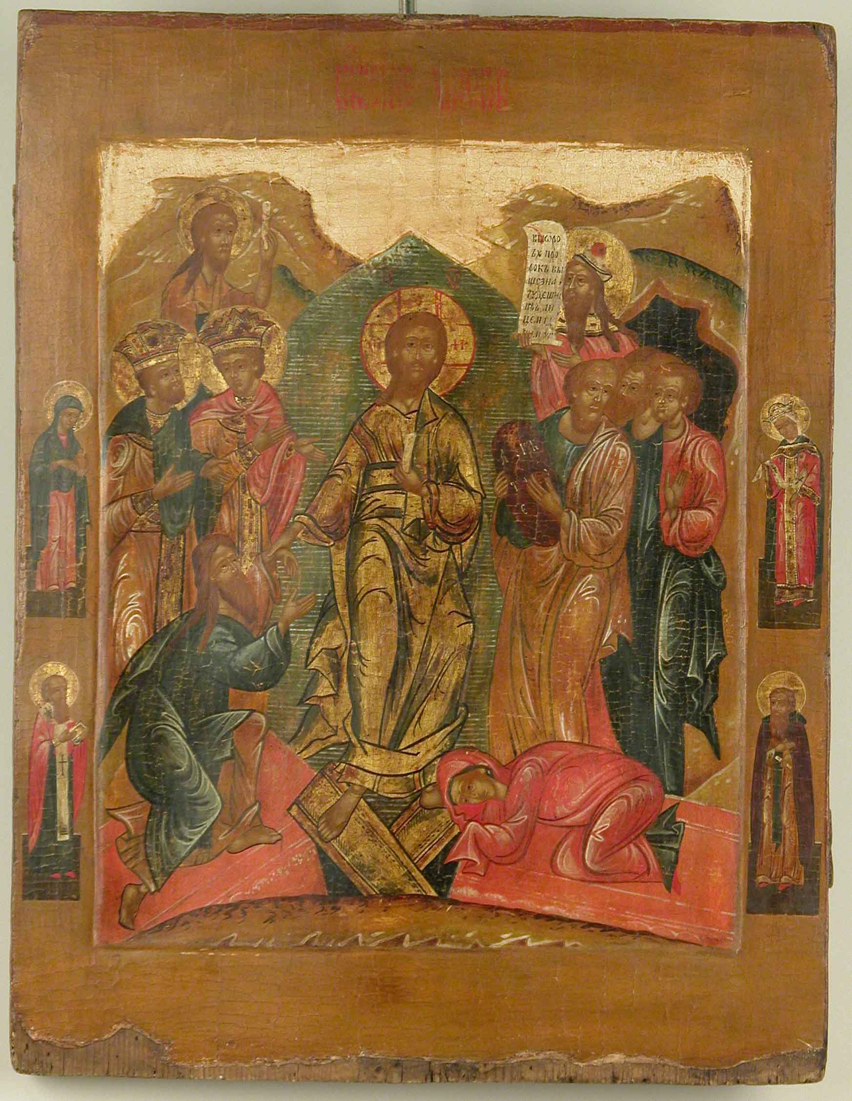 Anastasis met randheiligen. Linksboven Maria van Magdala, rechtsboven vorstin Olga van Kiev.